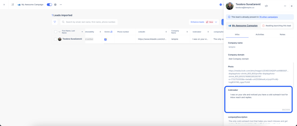 Once the icebreaker is generated, you can make edits if needed.To use it in your campaign, just type {{icebreaker}}.