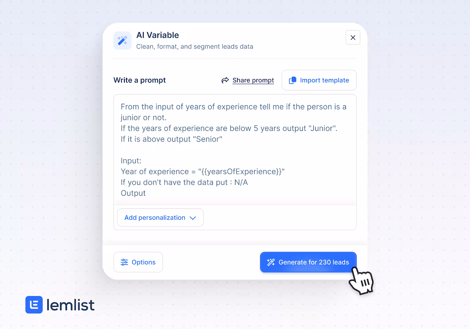 Additionally, lemlist’s AI Variables feature allows you to use a single prompt on all your leads.