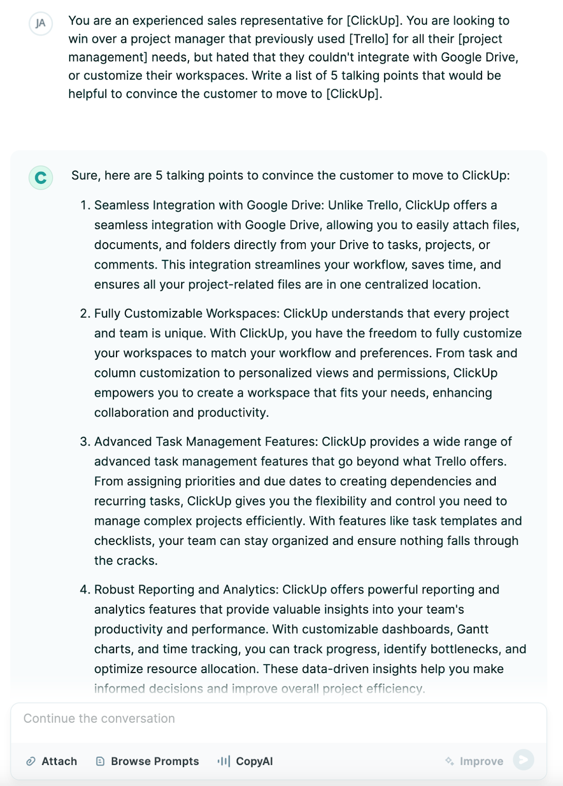 _You are an experienced sales representative for [ClickUp]. You are looking to win over a project manager who previously used [Trello] for all their [project management] needs but hated that they couldn’t integrate with Google Drive, or customize their workspaces. Write a list of 5 talking points that would be helpful to convince the customer to move to [ClickUp]._