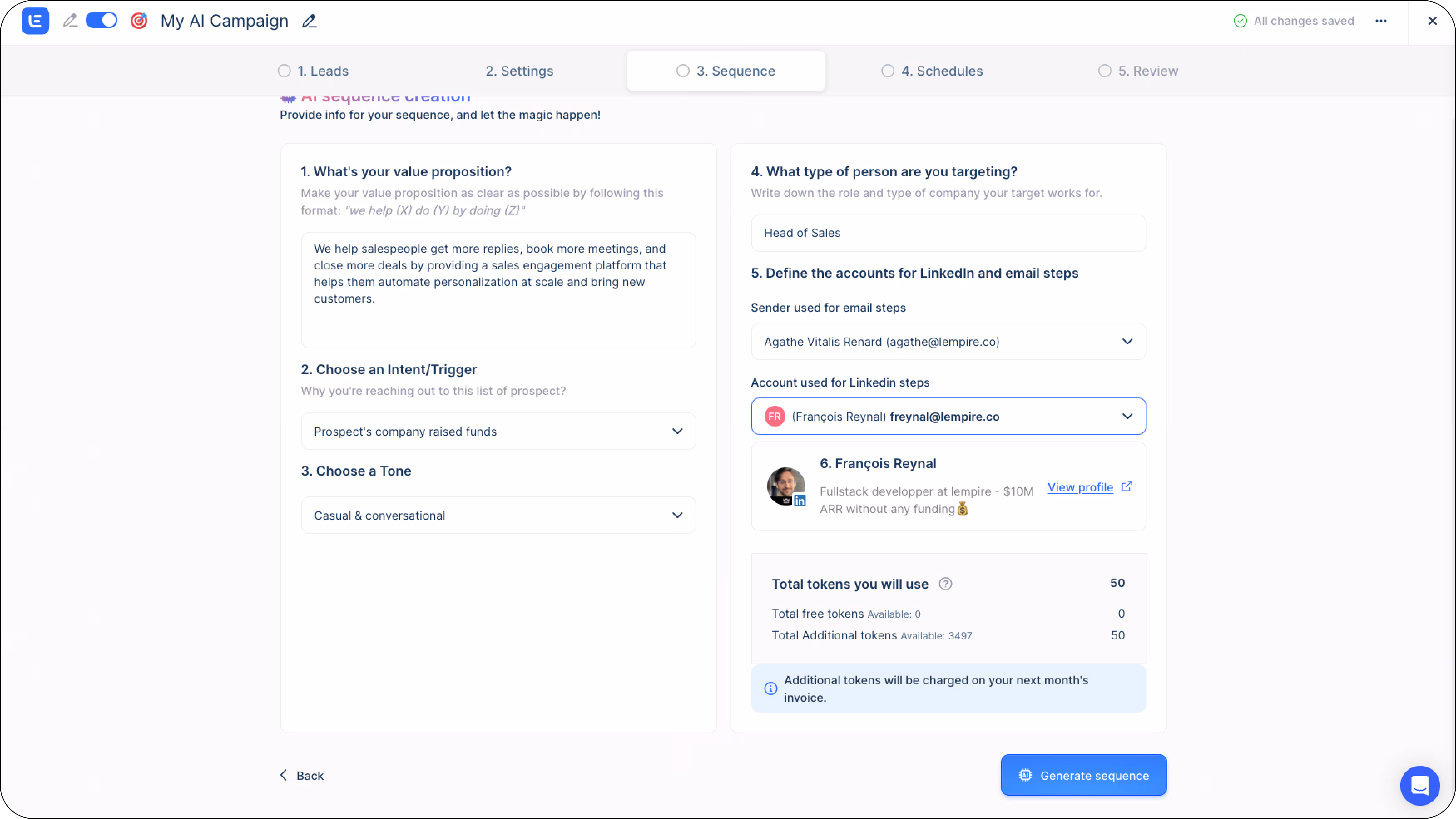 2. Fill in the requested data (value proposition, intent, tone, target audience, etc.). This trains the AI to use the best sequence and copy to reach out to your prospects on LinkedIn.