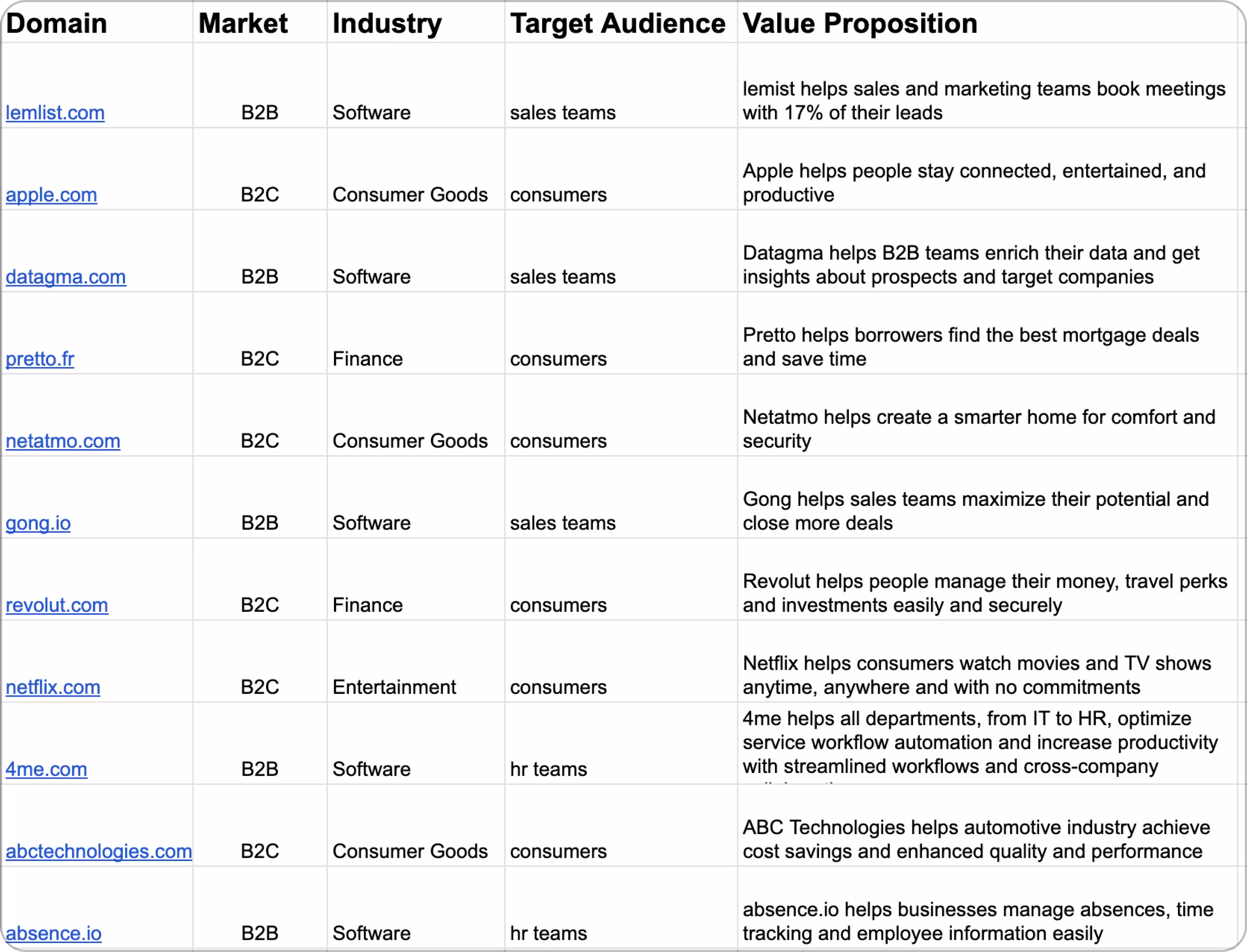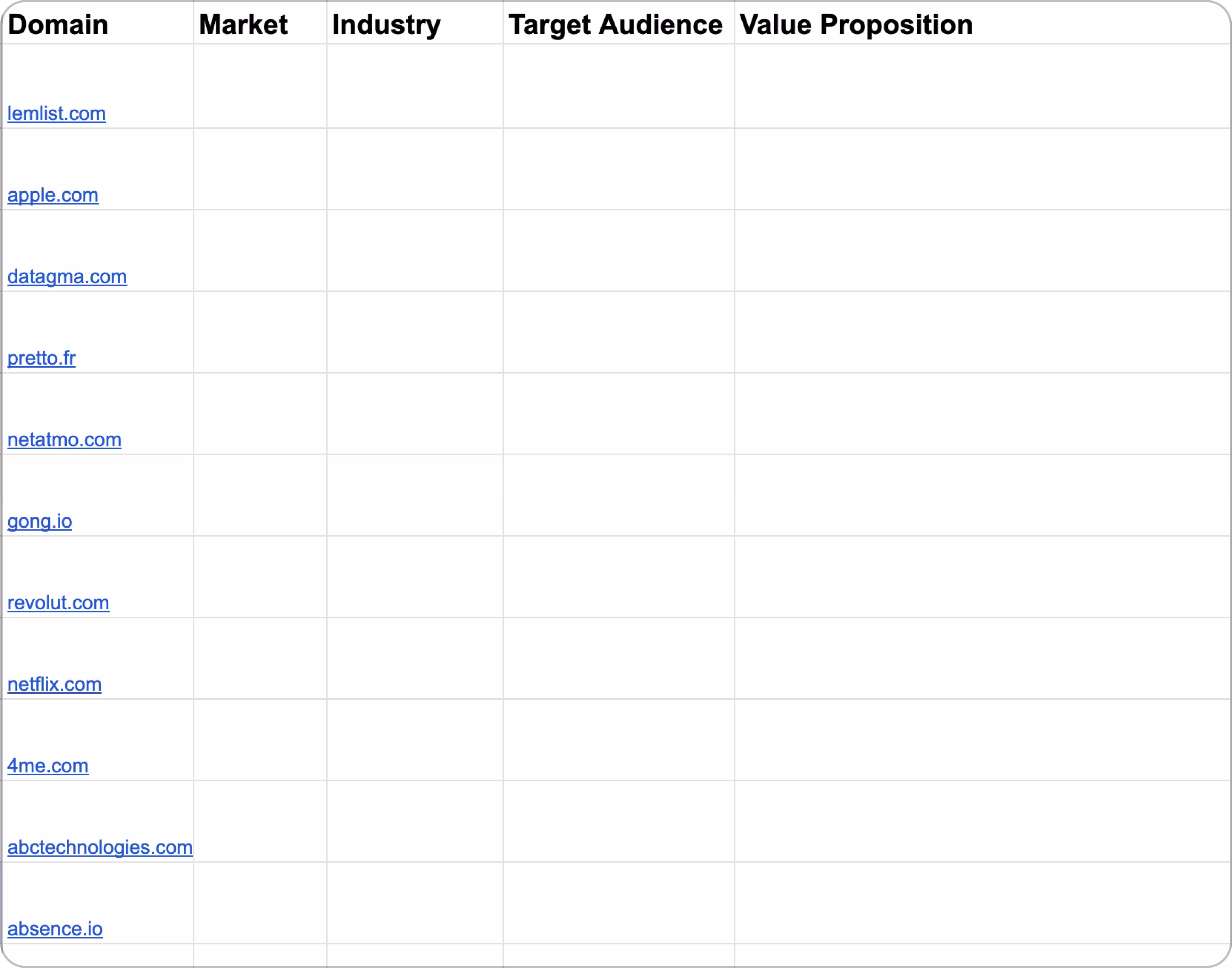 7. In your Google Sheet, make sure your columns are named exactly like this: Domain, Market, Industry, Target Audience, Value Proposition.