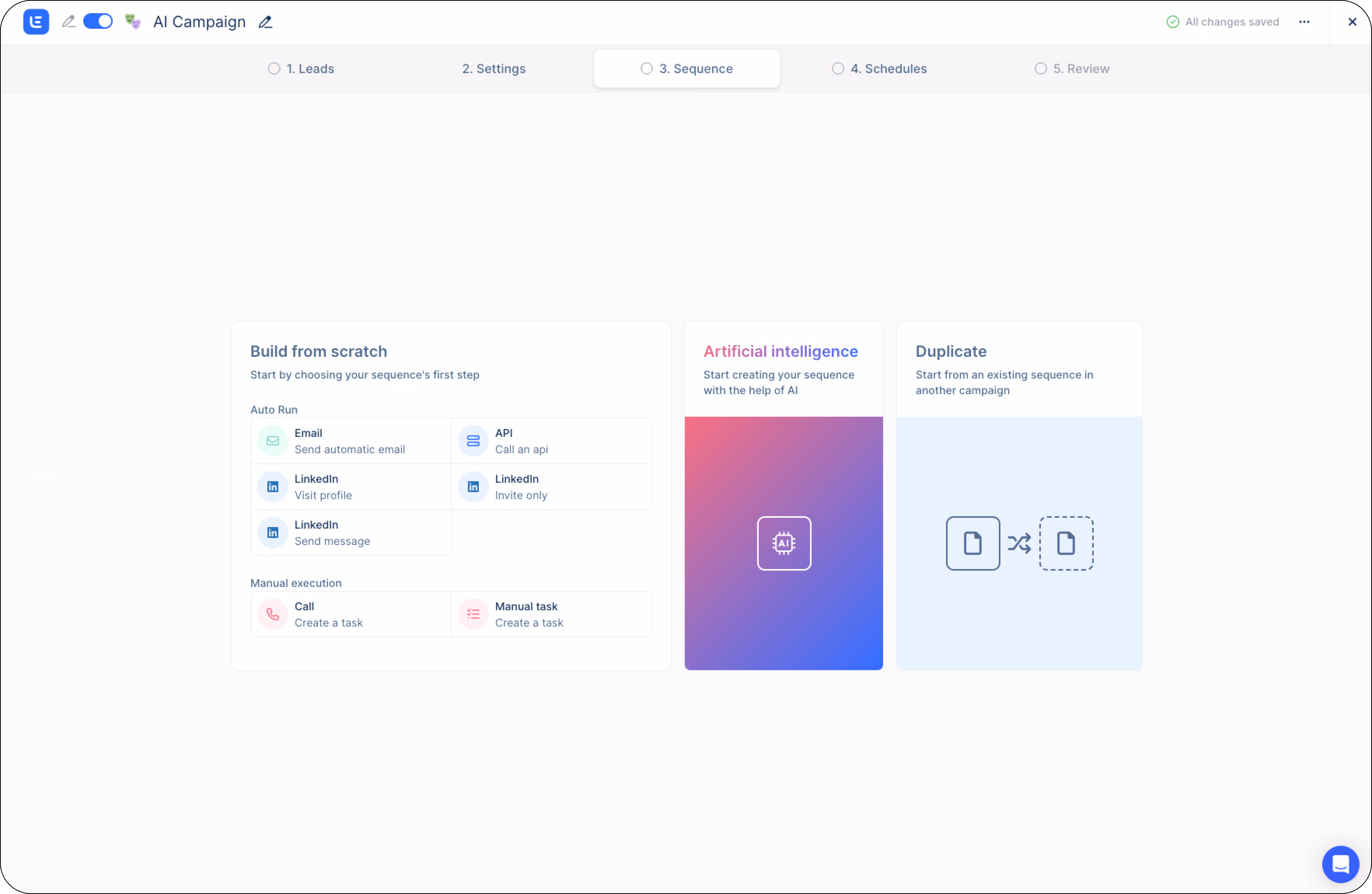 - Create a new campaign in the lemlist app, and choose “Artificial intelligence” under the Sequence tab.
