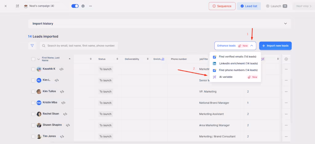 Step 2: ➡️ Click on Enhance leads (1) and then AI variable (2)