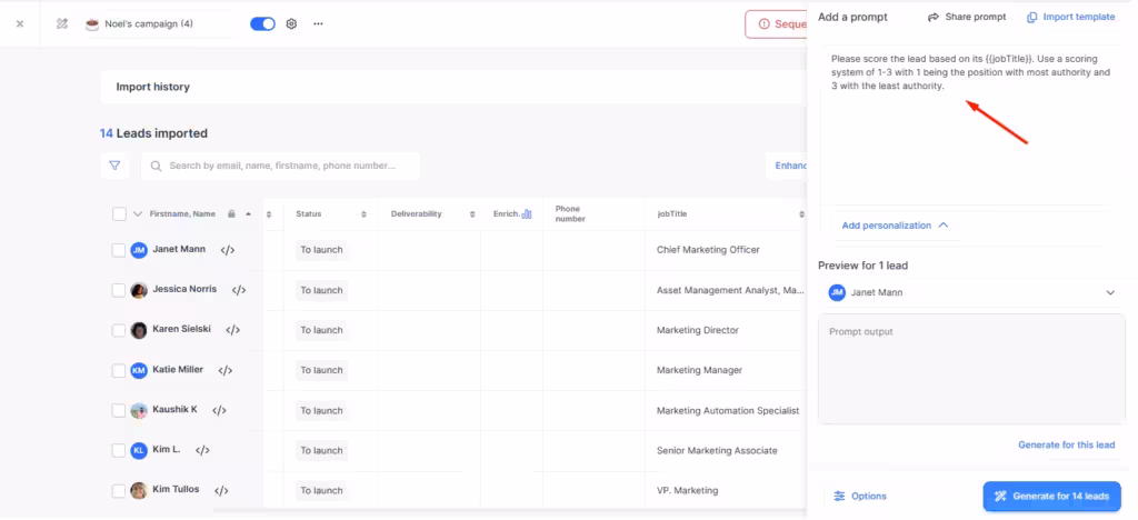 Step 6: ➡️ Try your prompt on one lead first by clicking Generate for this lead