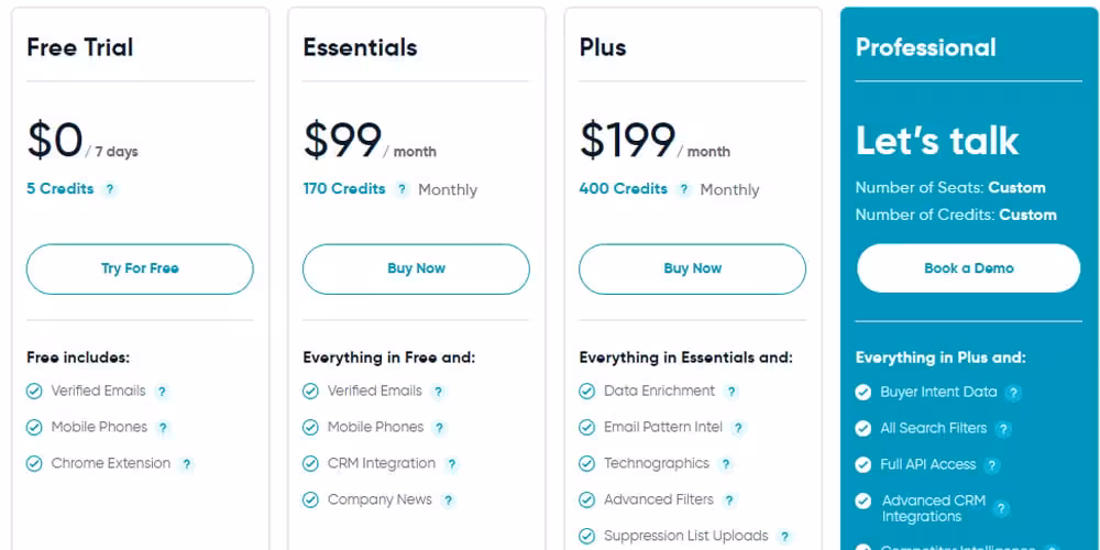 UpLead offers a 7-day free trial so you can test some of its basic features. Paid plans start at $99/month, but if you need access to some of its more advanced features, you have to subscribe to one of the more expensive plans.