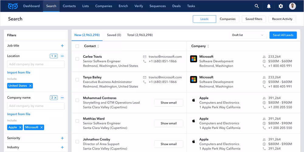 UpLead, a unique platform, stands out with its ability to help you identify high-quality leads from its vast database of 155M+ verified leads. It’s not just about the quantity but also the quality, as you can narrow down your search using 50+ search criteria, including industry, company, job title, location, and more.