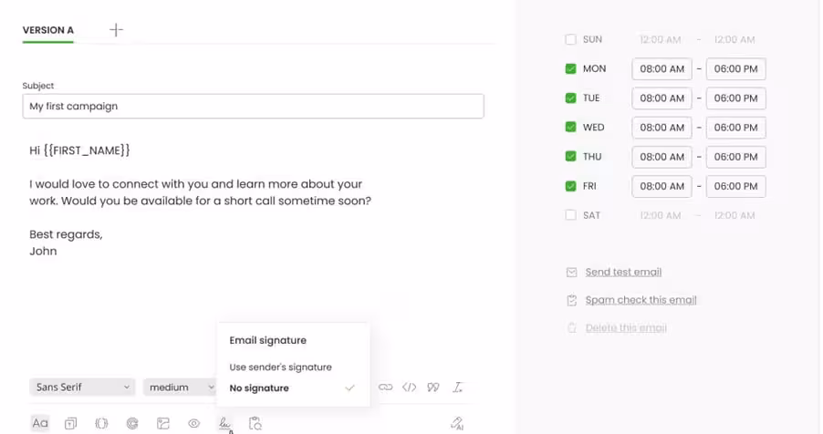 When setting up a campaign, its clean interface helps you add new options, sequence for emails, or setting a schedule for email sending.