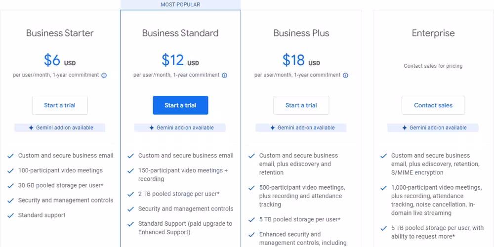 Google Calendar offers a free plan that you can use endlessly. If you need more features, such as an increased number of meeting participants or a custom business email address, you’ll have to subscribe to one of its paid plans, starting from $6/month.