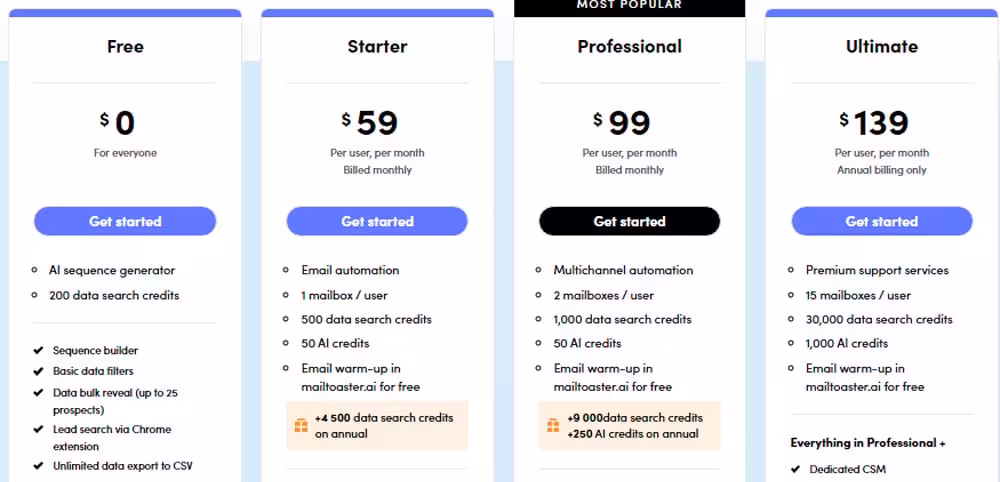 For example, the Starter plan ($59/month) gives you 50 AI credits. You spend 2 credits for each personalized email and 1 credit for any other type of personalization. When your AI credits run out, you must buy more or upgrade your plan.