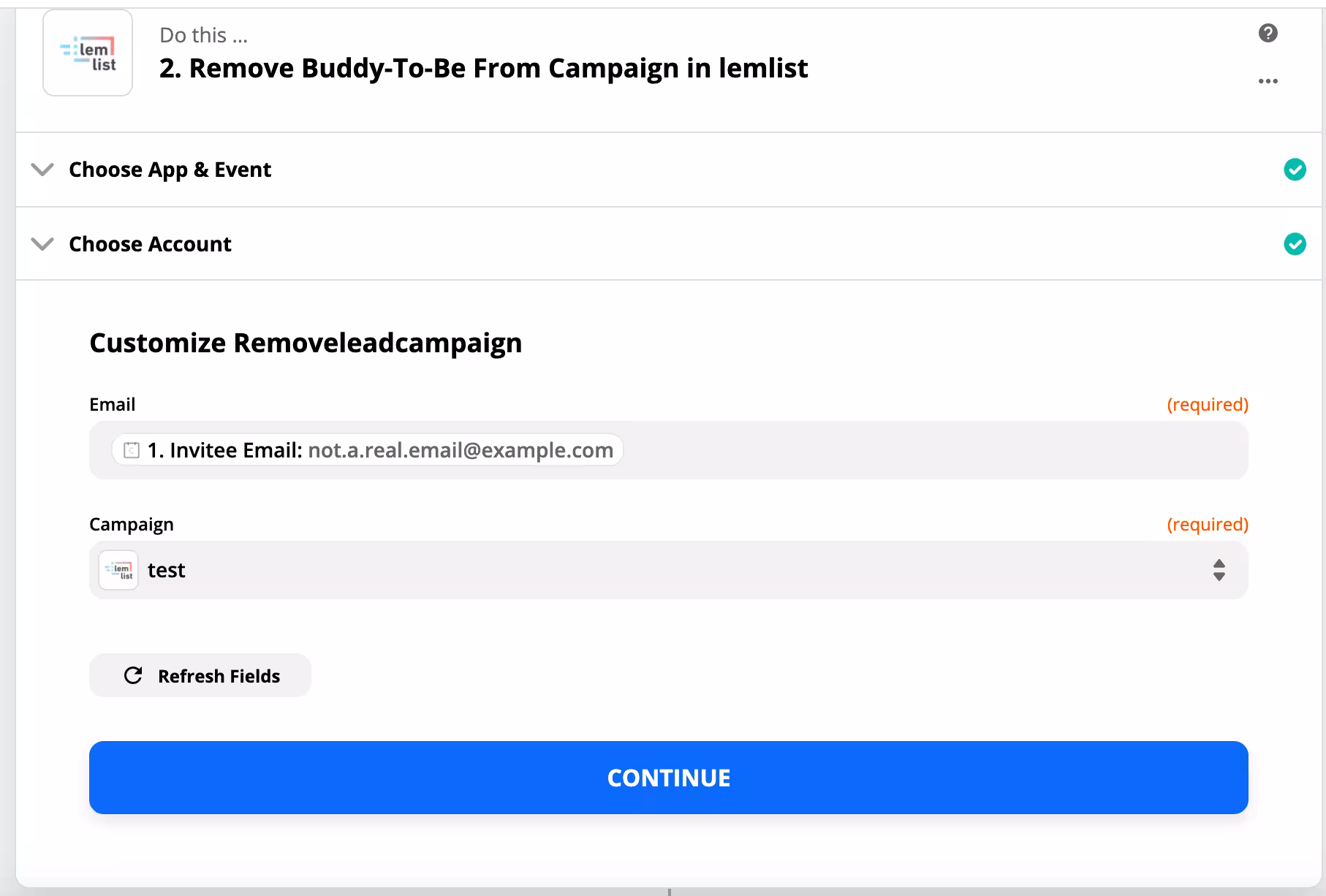 To do that, we pick lemlist and select “Stop emailing a Buddy-to-be in a campaign” action event.