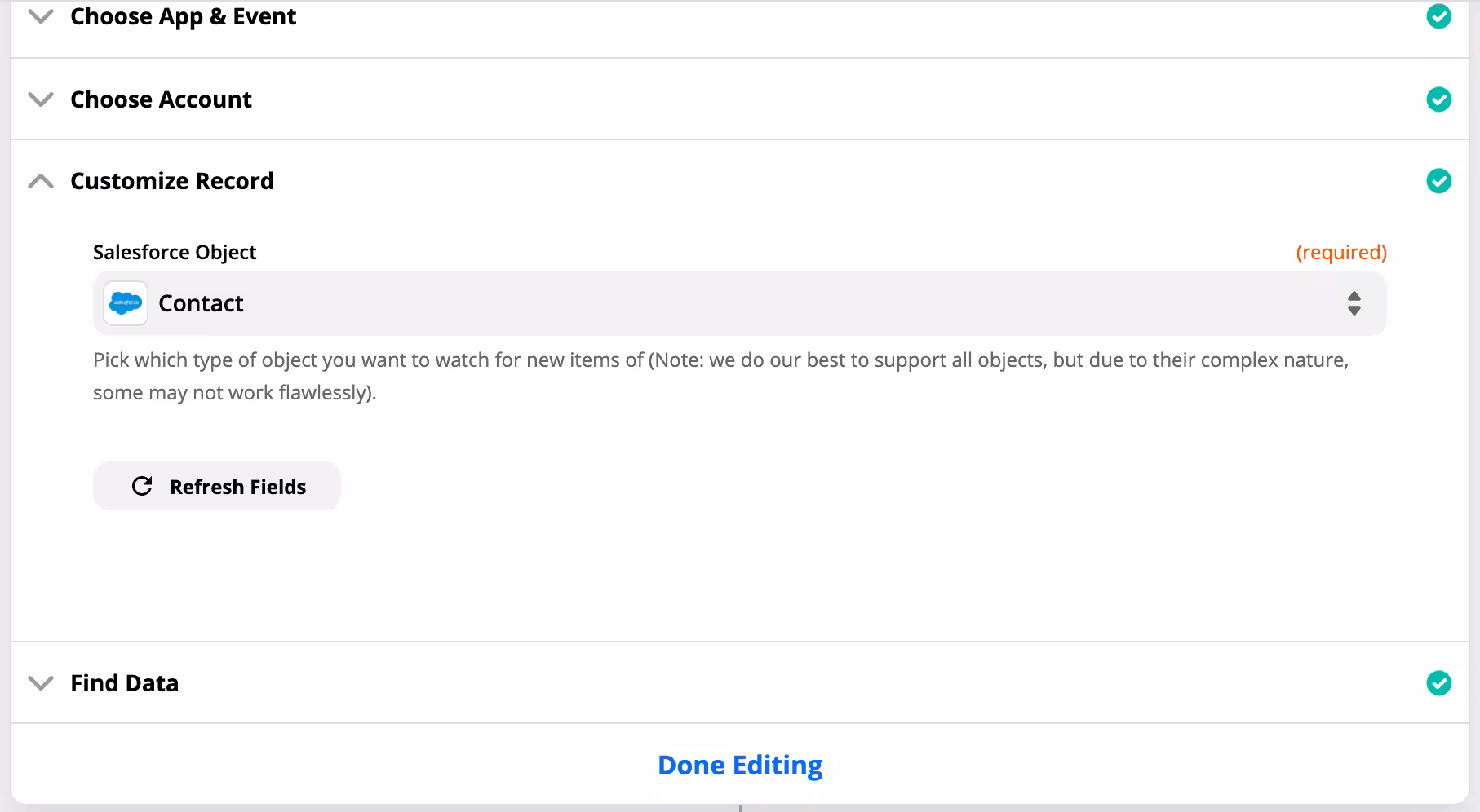 In the beginning, you need to pick Salesforce trigger for example “New Contact created”. You can pick your own.