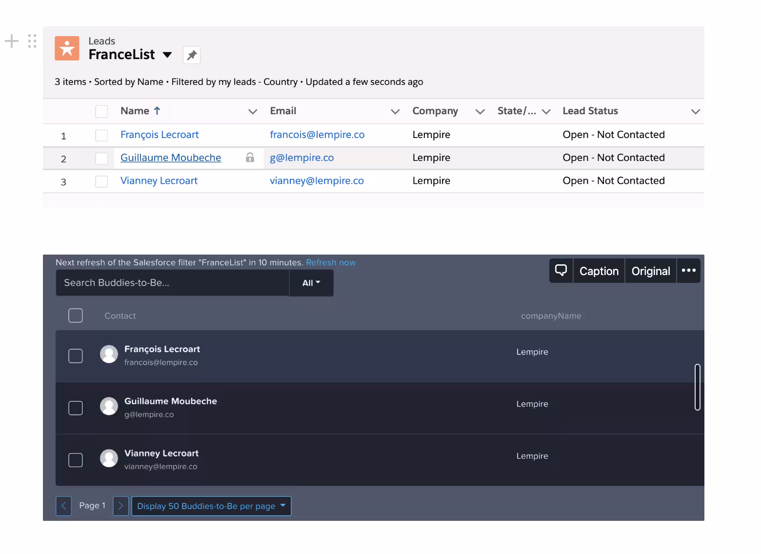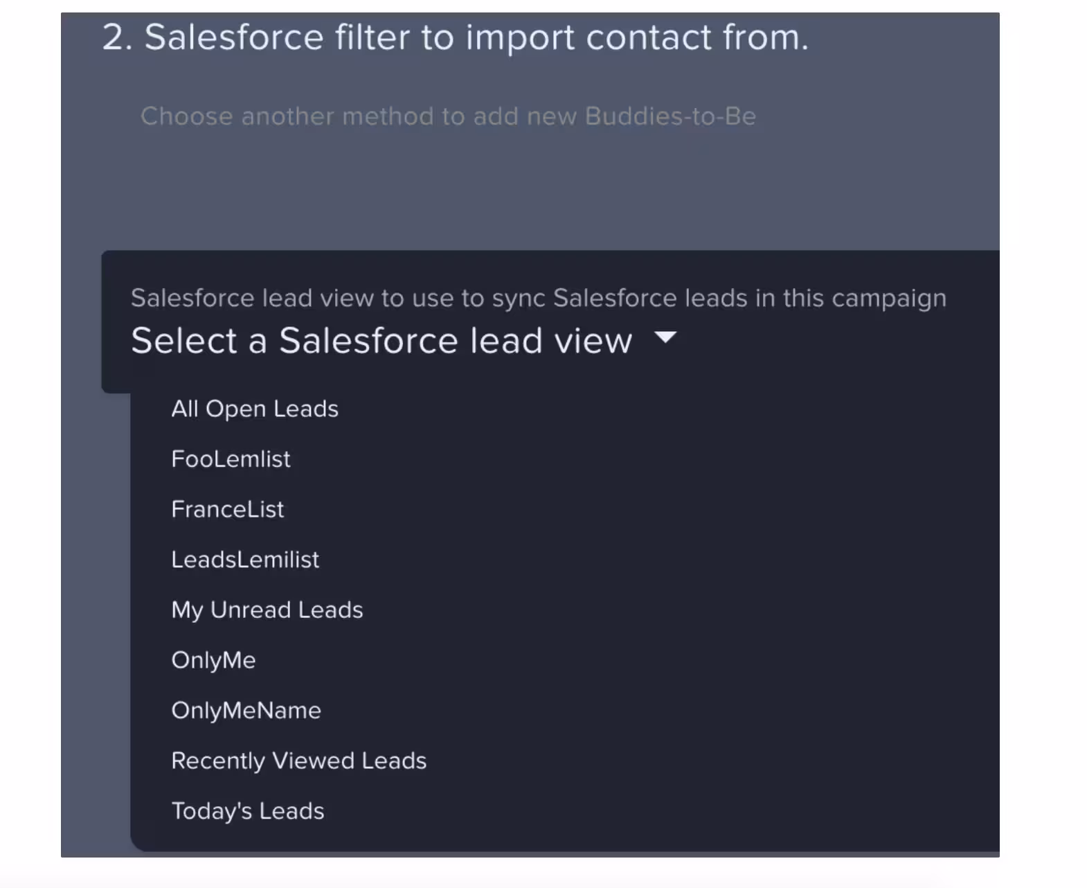 After selecting a filter (lead view), buddies-to-be will be populated from Salesforce and it will be the same set of leads with the same properties as shown in your particular lead view in your salesforce instance (you can add/remove fields in lead view as necessary).
