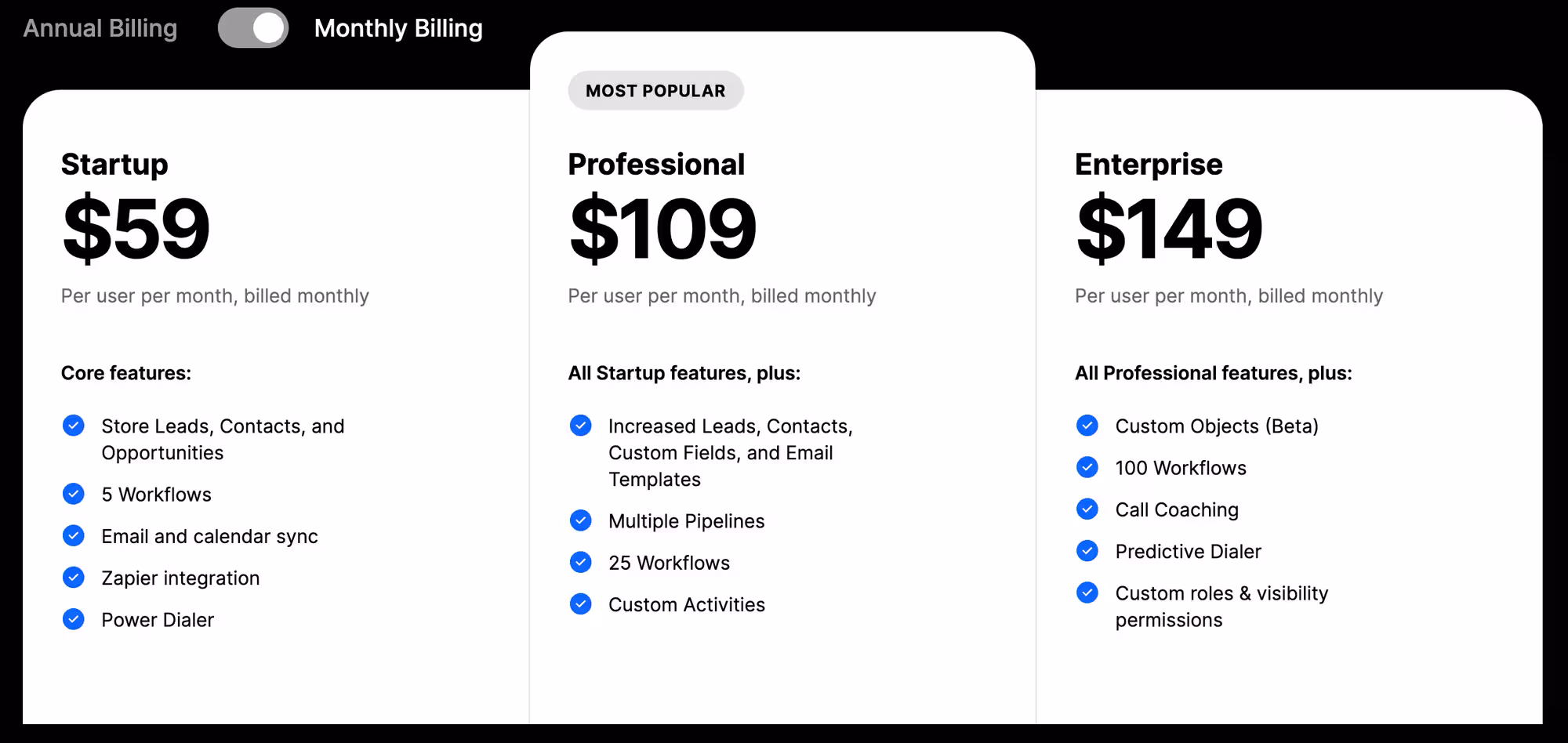 - You’re a small sales team or solopreneur: The Startup plan ($49/month/user) offers core CRM functionalities like lead and contact management with basic automation (3 workflows). This can be sufficient for a small team starting out.