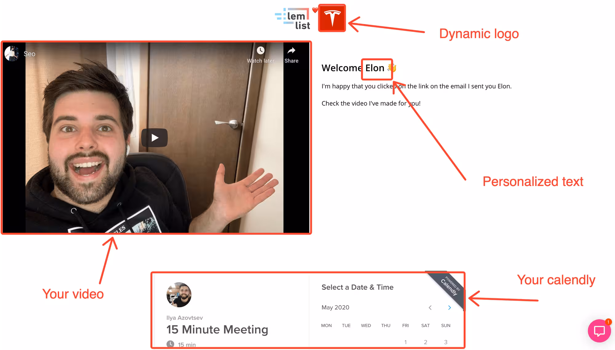 When people click on the video, they go to a dedicated landing page, where they will see a few more personalized touchpoints, along with the lemcal link to book a demo with me.