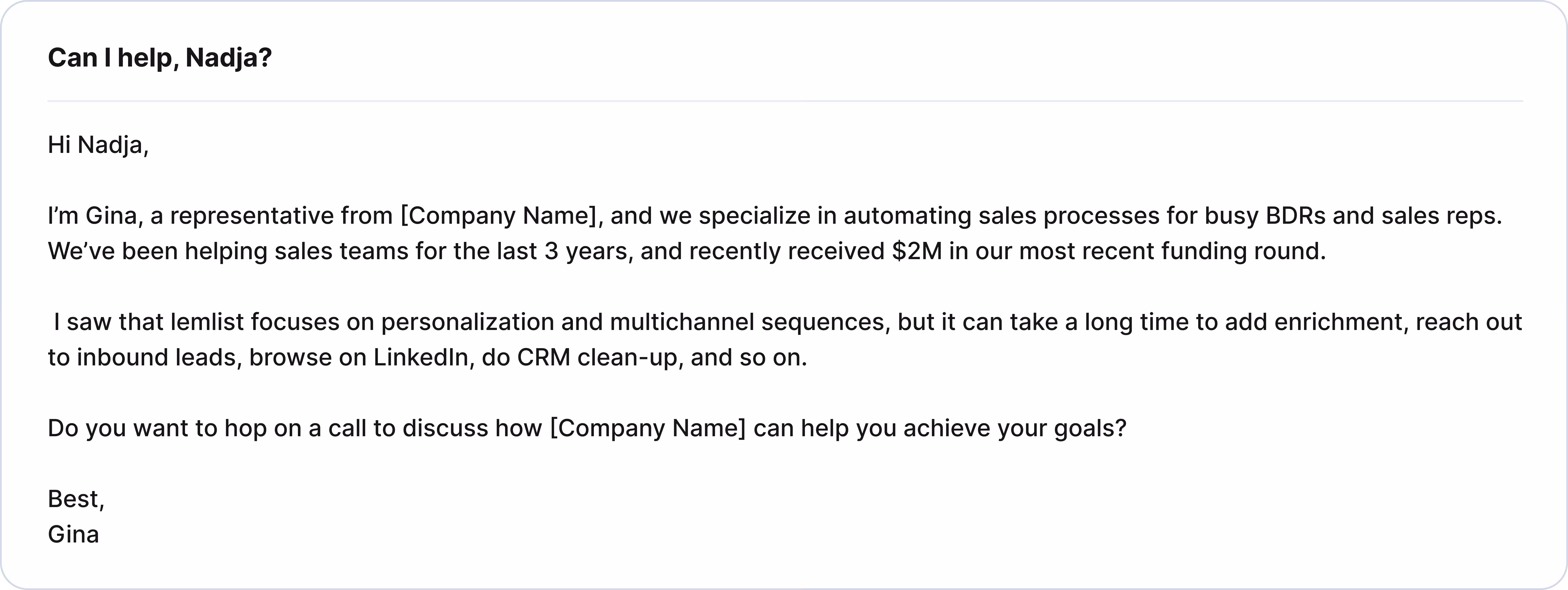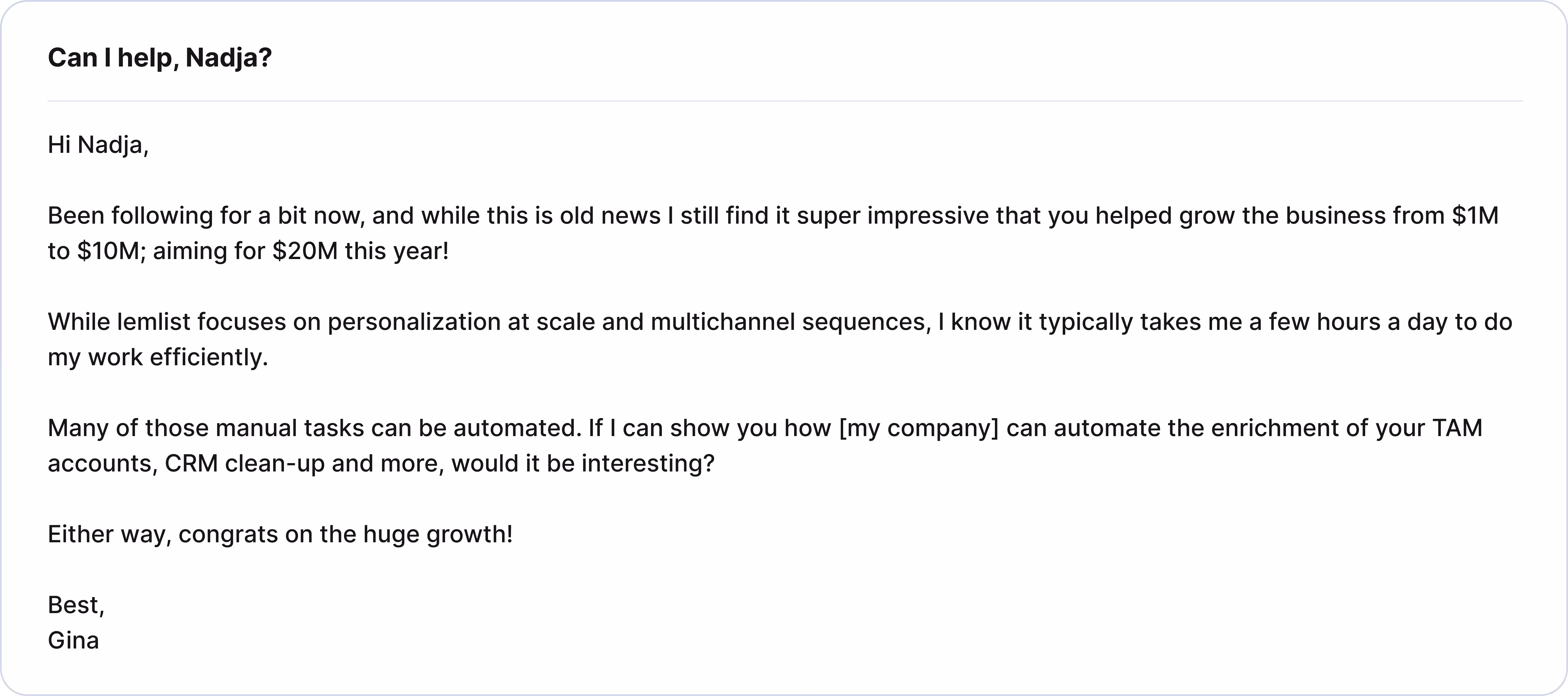 She shows that she knows the prospect by congratulating her on the company’s funding round, and she clearly states what the prospect can get out of this email: saved time by automating sales processes.