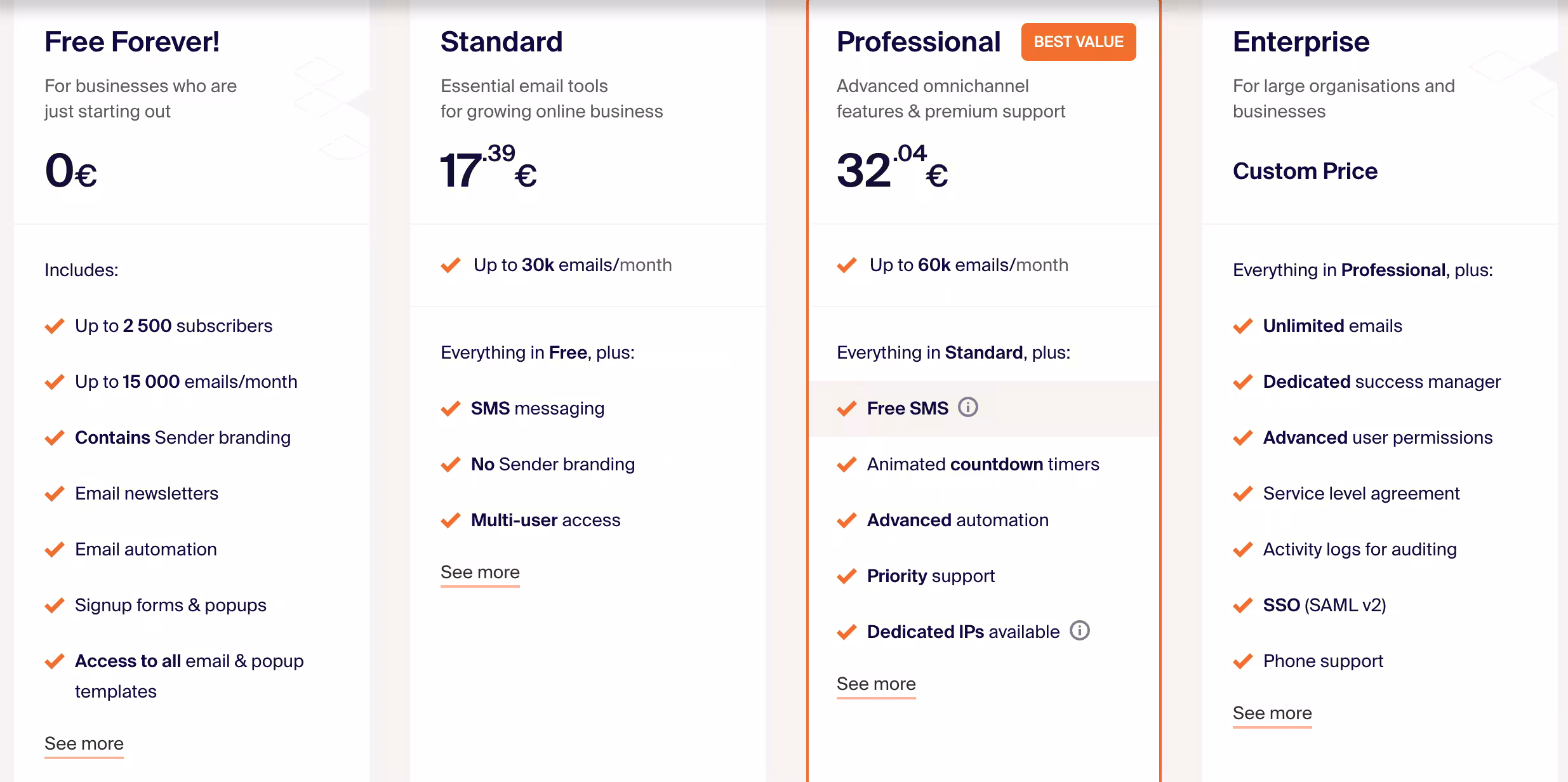 - A Business Plan from €15/month is great for marketing managers and e-commerce pros. However, if you want to remove Brevo branding from this plan, you have to pay a €8.10/month fee.
