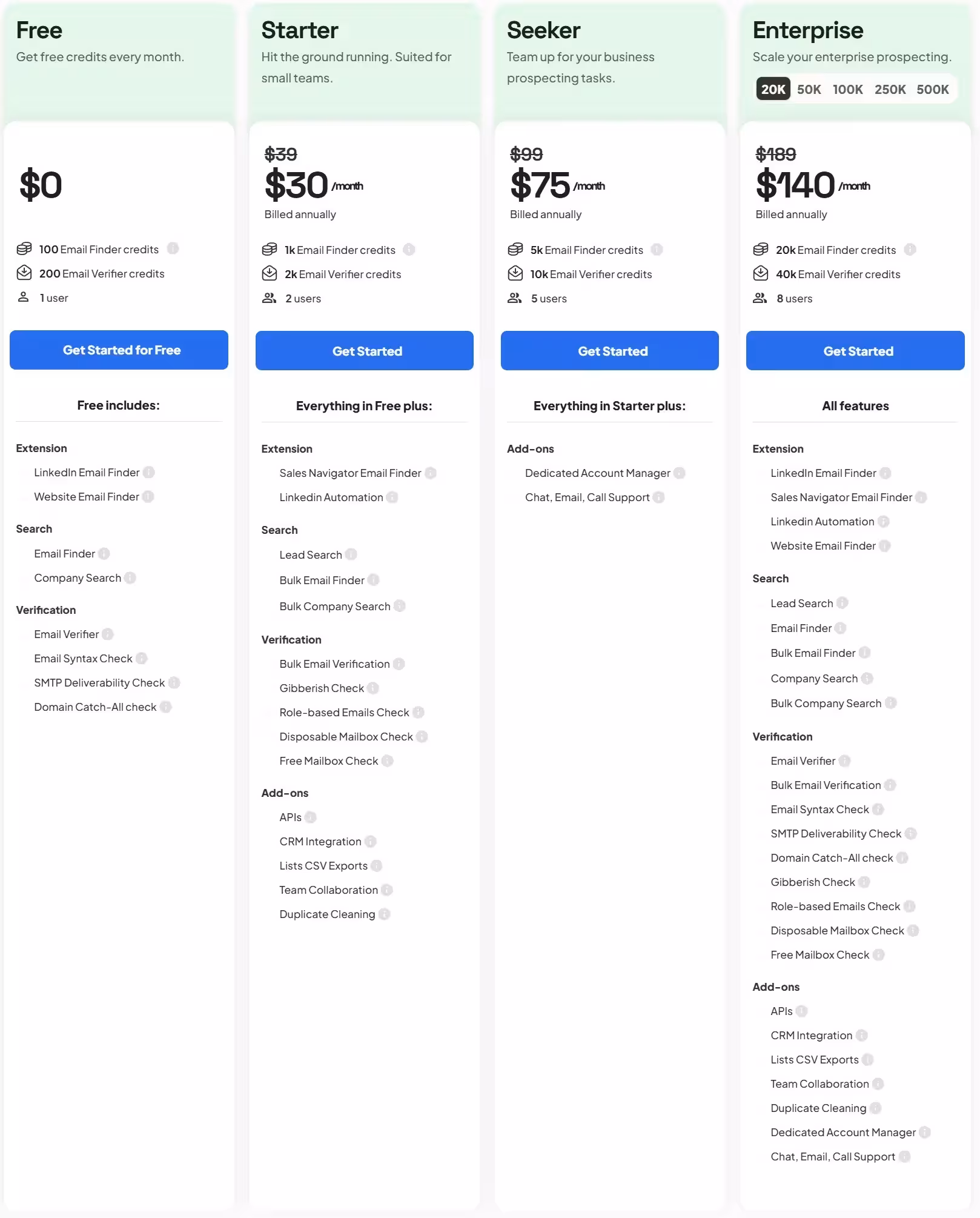 You can get up to 100 email address per month using the free plan. LinkedIn outreach is available on Multichannel Expert plan and Enterprise.