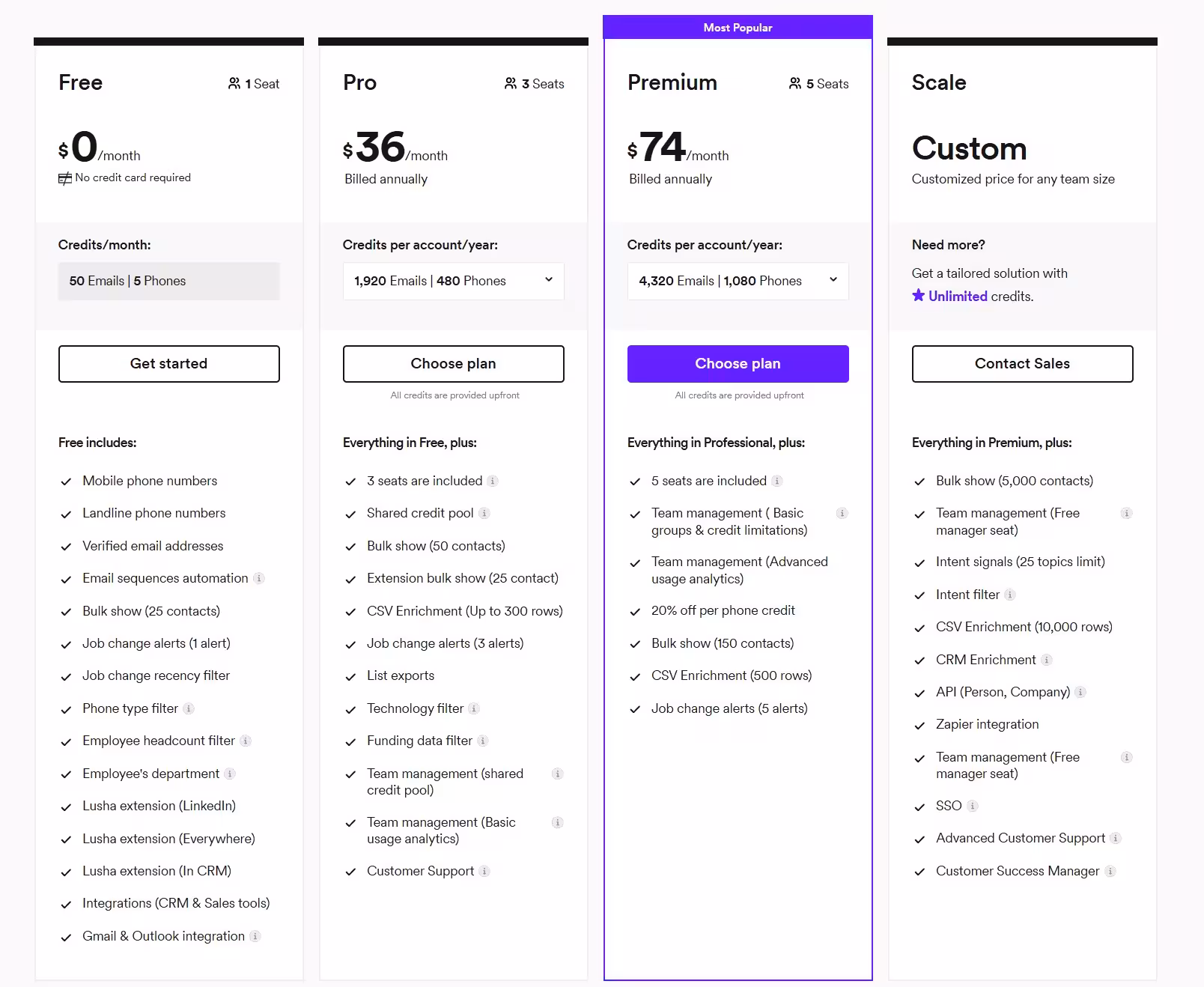 Lusha offers four different pricing plans, which can also vary depending on the amount of credits you decide to purchase with your subscription.