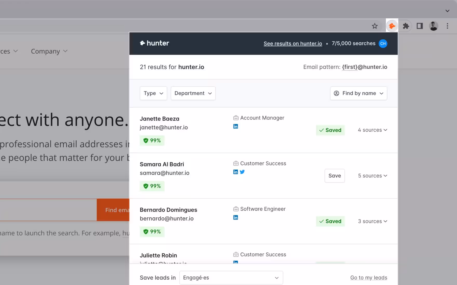 → Hunter.io gives you additional information about the email addresses, such as their sources and confidence scores.