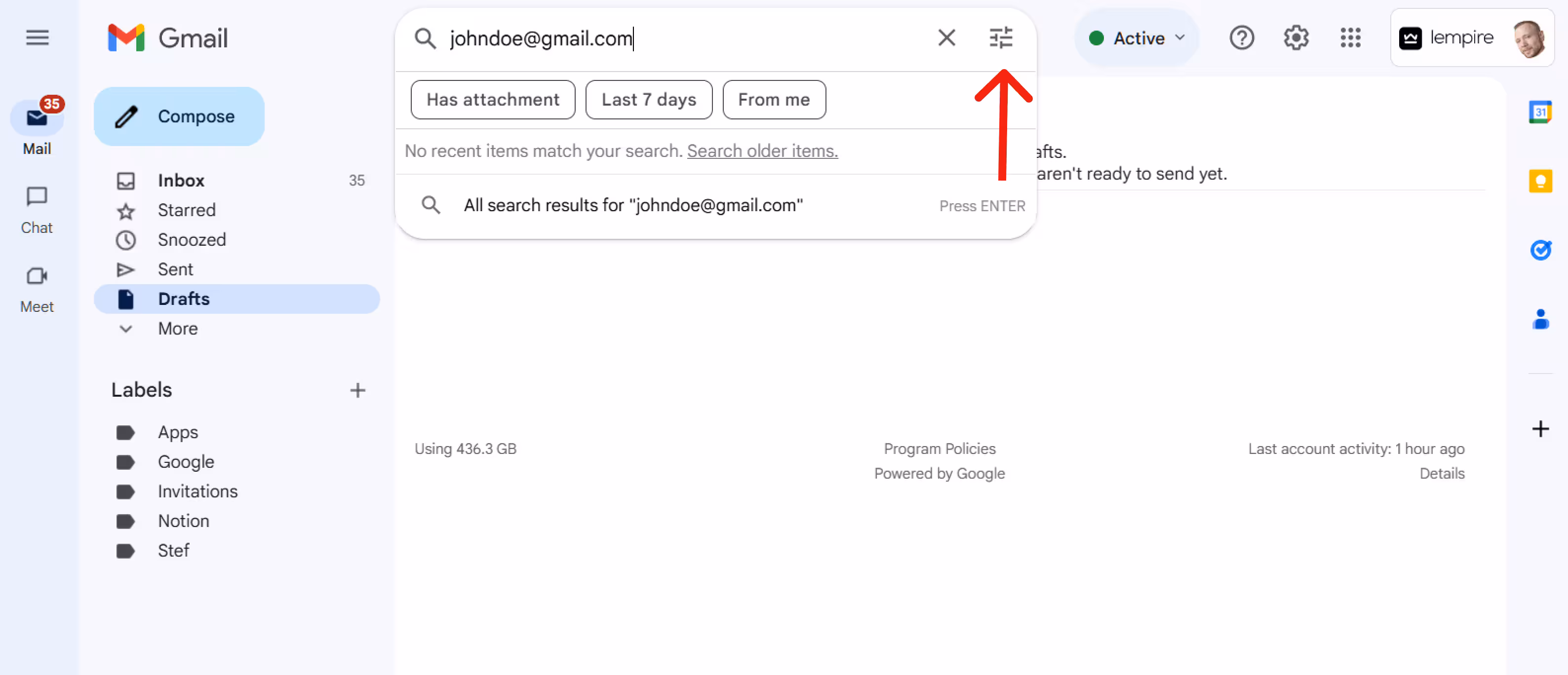Step 2: In Gmail, enter the email address in the search bar and click the “Show search options” button.
