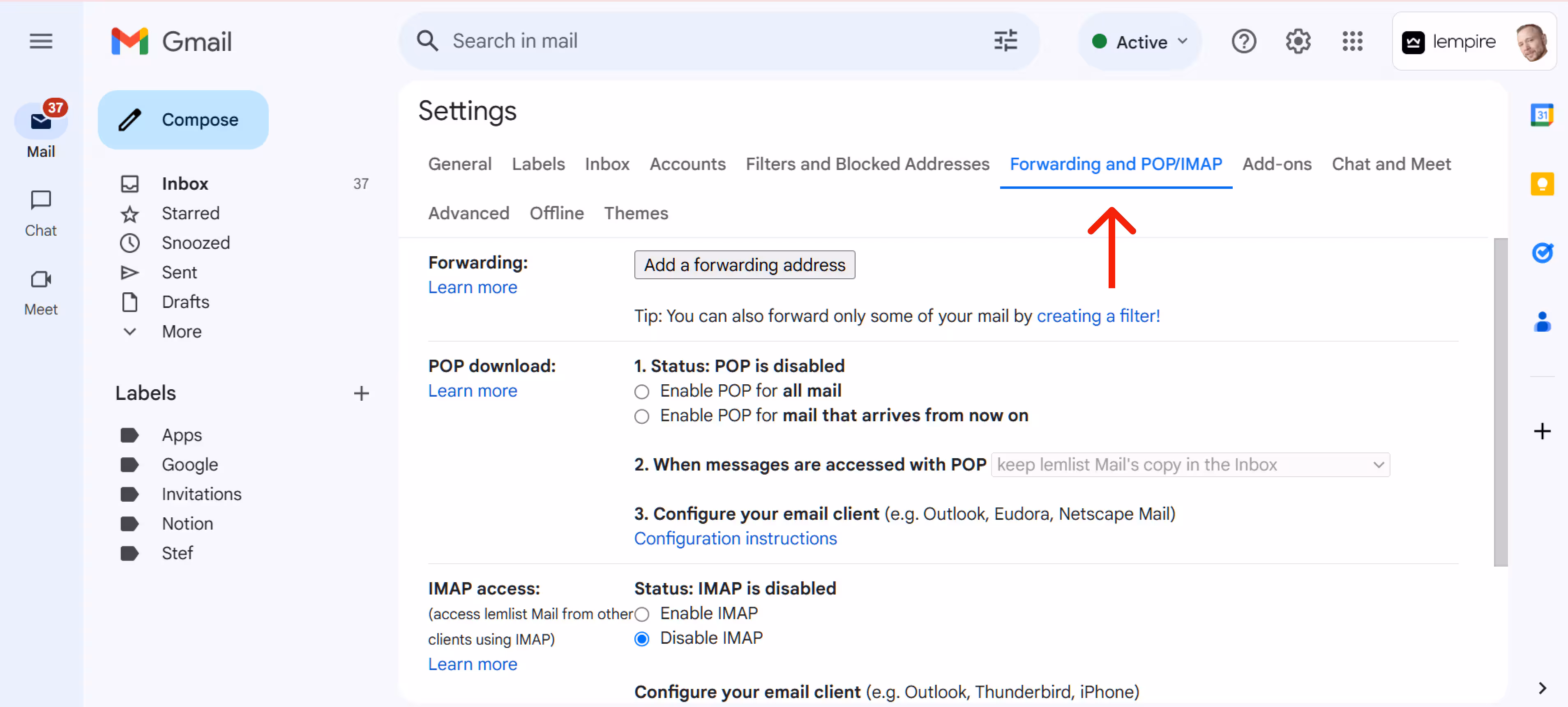 Step 9: Return to the “Forwarding and POP/IMAP” tab.