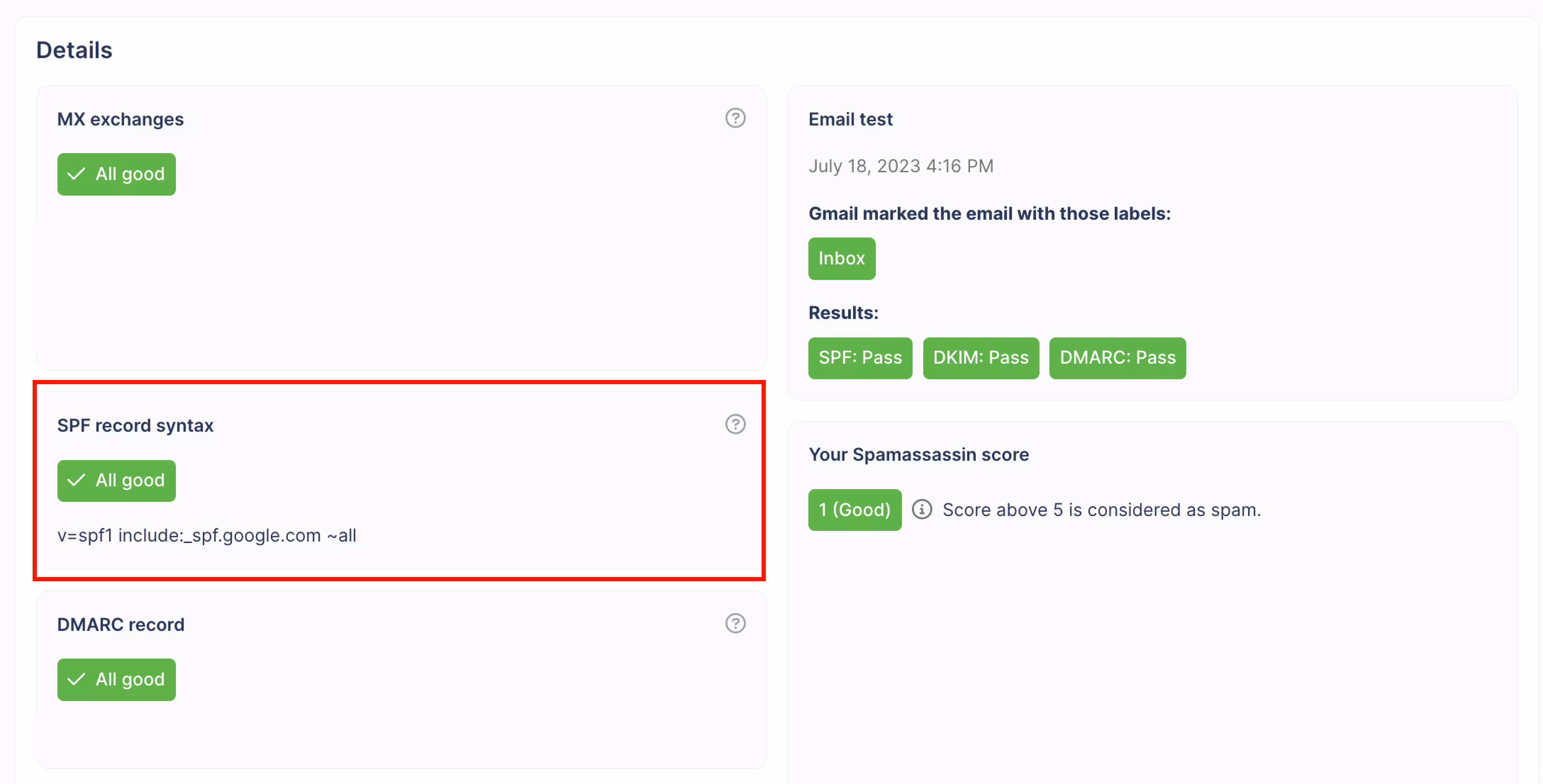 Of course, if you see the green “All good” sign, then your SPF formatting is already set up and protecting you from scammers and the spam folder.