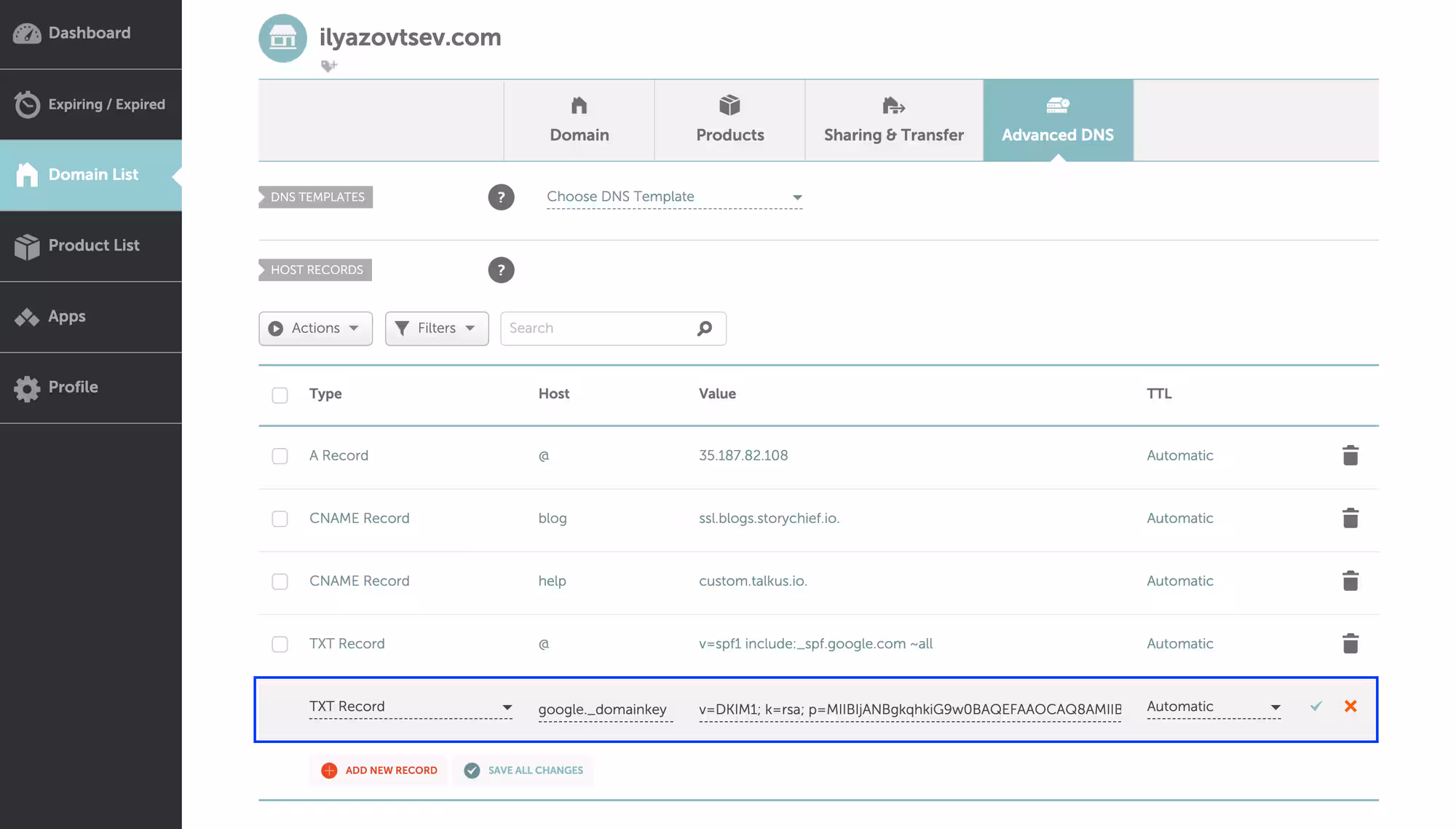 Now click “Generate new record” and copy the hostname and TXT record value: