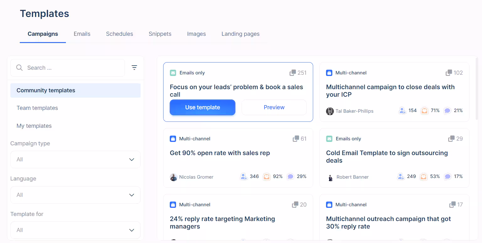 If you need some help coming up with compelling multichannel campaigns, we’ve got you covered at lemlist. With your subscription, you can access the Template section from your dashboard, and gain access to plenty of multichannel campaigns, emails, landing pages, schedules, and more.