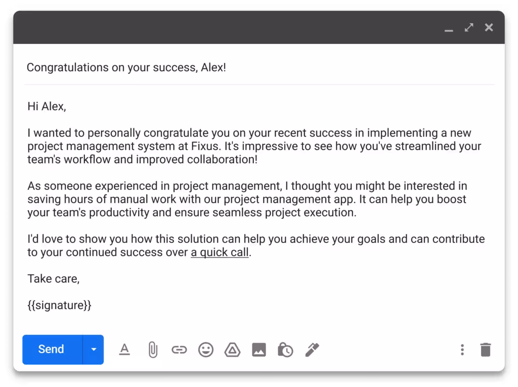 In the second example, gathering Alex’s information helped you personalize your message and connect with him more meaningfully. By referencing a recent achievement and acknowledging his expertise in project management, you demonstrate a genuine interest in his work.