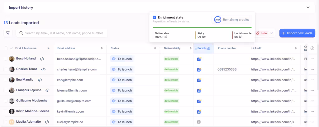 Once you have enriched your leads, your list will look like the image below. In this case we have chosen not disclose phone numbers, however, lemlist finds +50% valid phone numbers.