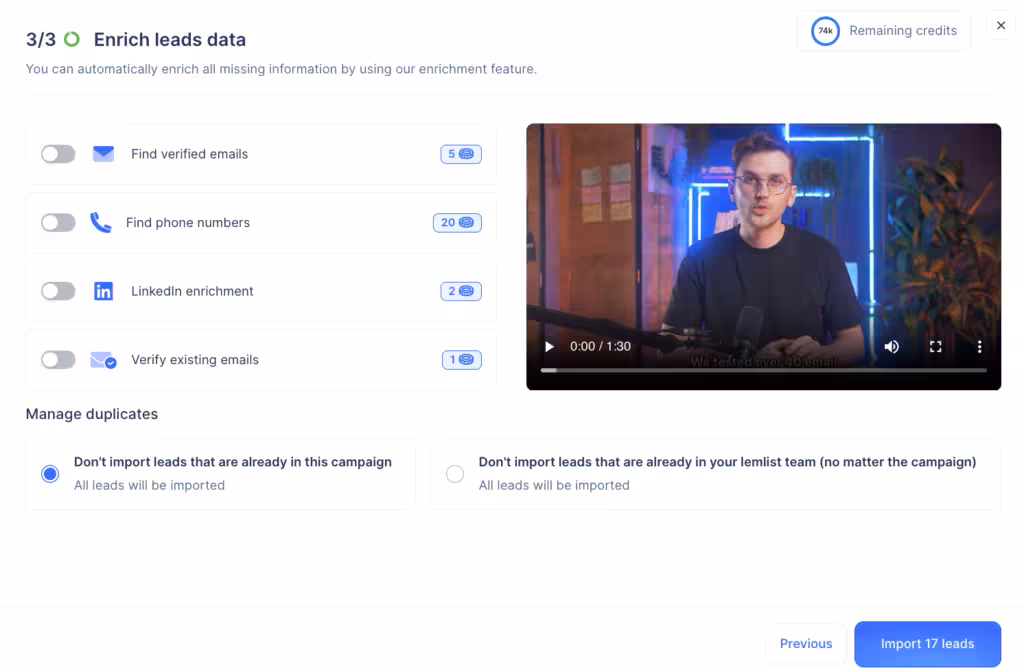 When selecting your leads, you can enrich them easily with the click of a single button and avoid importing duplicate leads.
