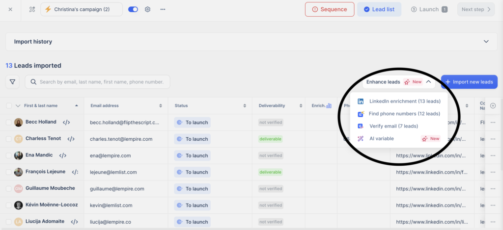 Once you have your campaign ready you simple have to click on Enhance leads where you will get the option to select LinkedIn enrichment, phone numbers, email verification or AI variables, where you can clean your lists, and segment and qualify your leads, among others (we’ll discuss AI variables further along too).