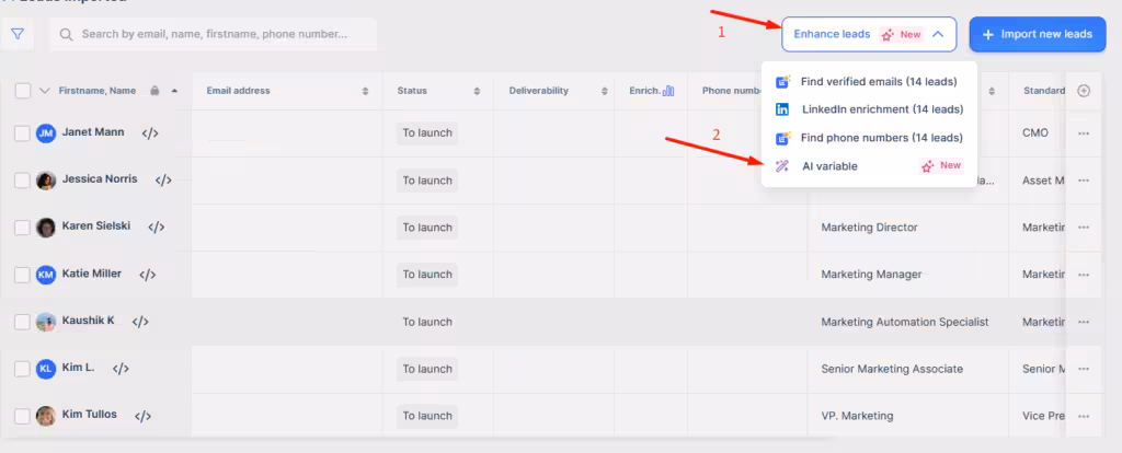Step 2: Go to your campaign’s lead list and click on “Enhance leads” and then on AI Variable