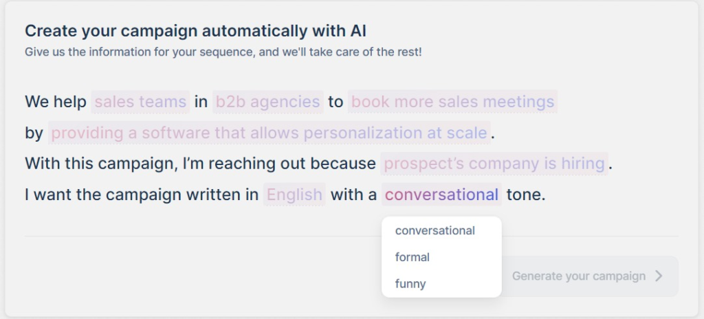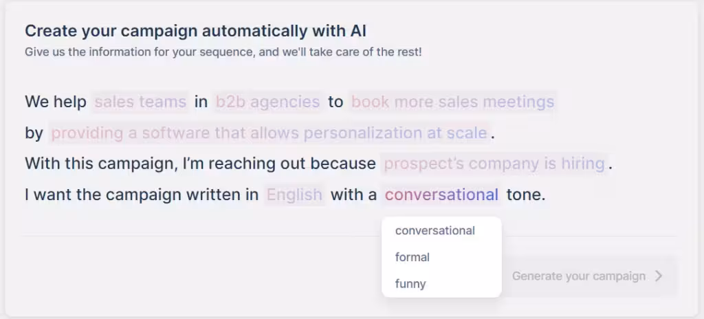 AI variables dig into data points like industry, job title and recent social media moves to craft intro lines that hit the mark with your leads.