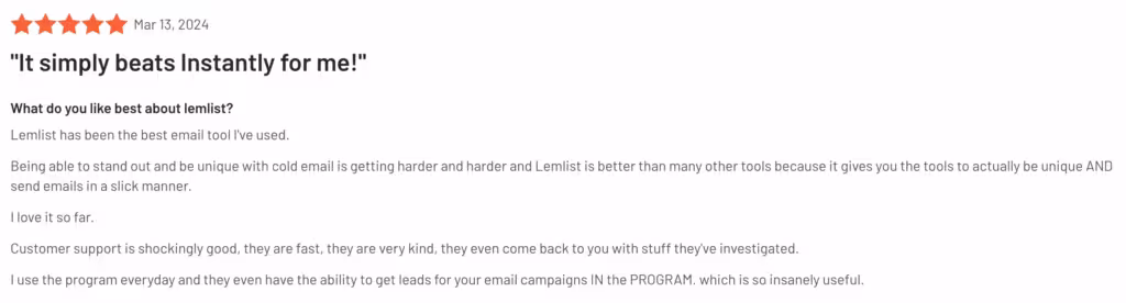 A user shared how he sees lemlist as superior to competitor Instantly.