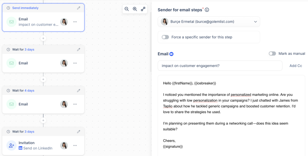 You can create sequences and automate follow-ups like in the campaign example above. Simply tell the tool where and when you want to reach out to your prospects and it will schedule everything for you.