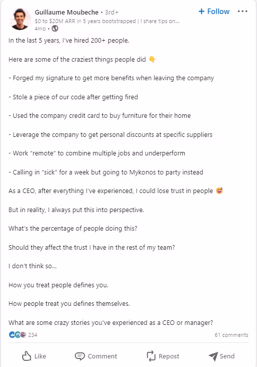 Take for example this post by Guillaume, he introduced a relatable (and albeit quite funny topic), there is no self-promotion, but there is a great opportunity to open a discussion and see how your peers deal with different insane situations.