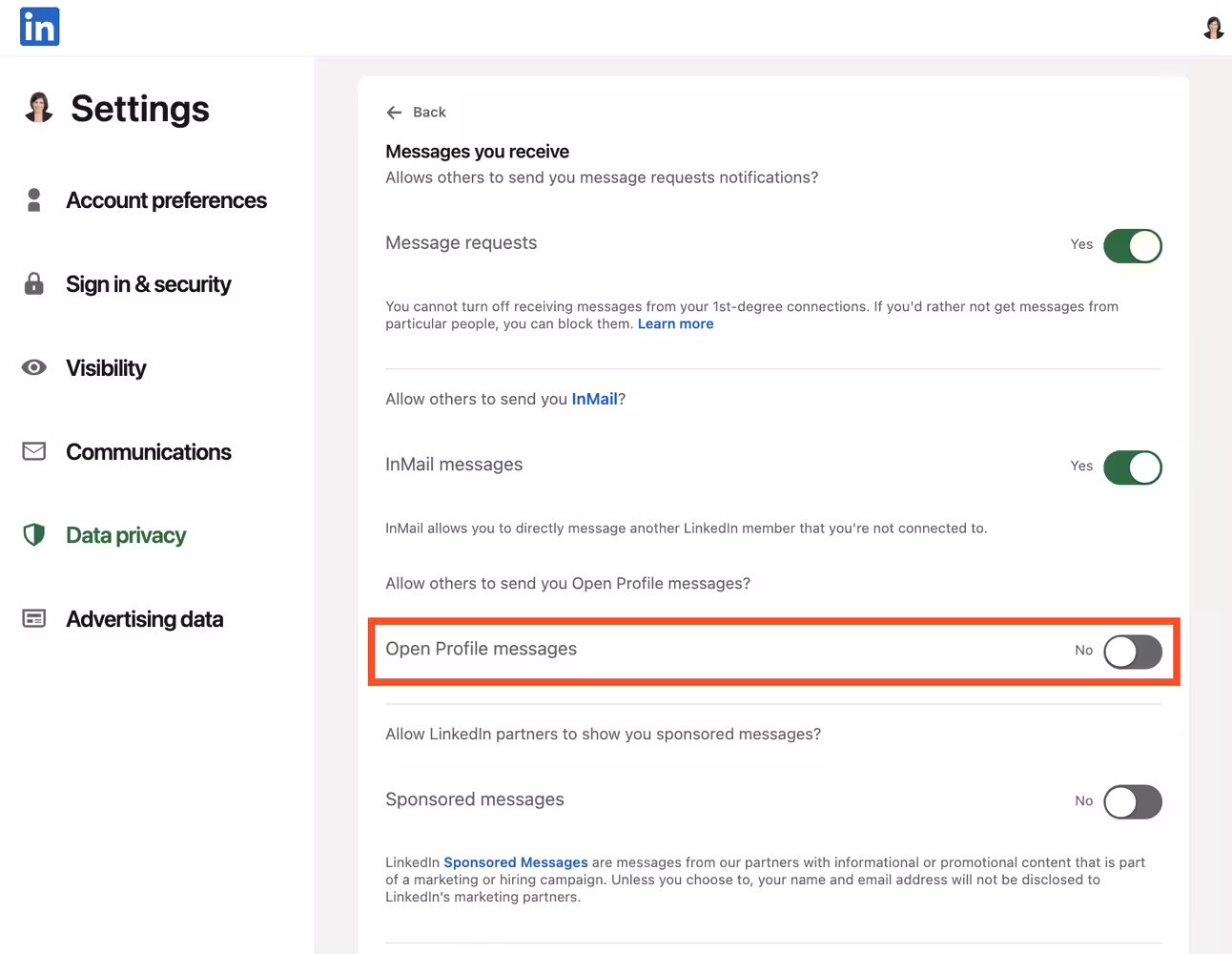 Here’s how you can turn on the Open Profile messages feature on LinkedIn: