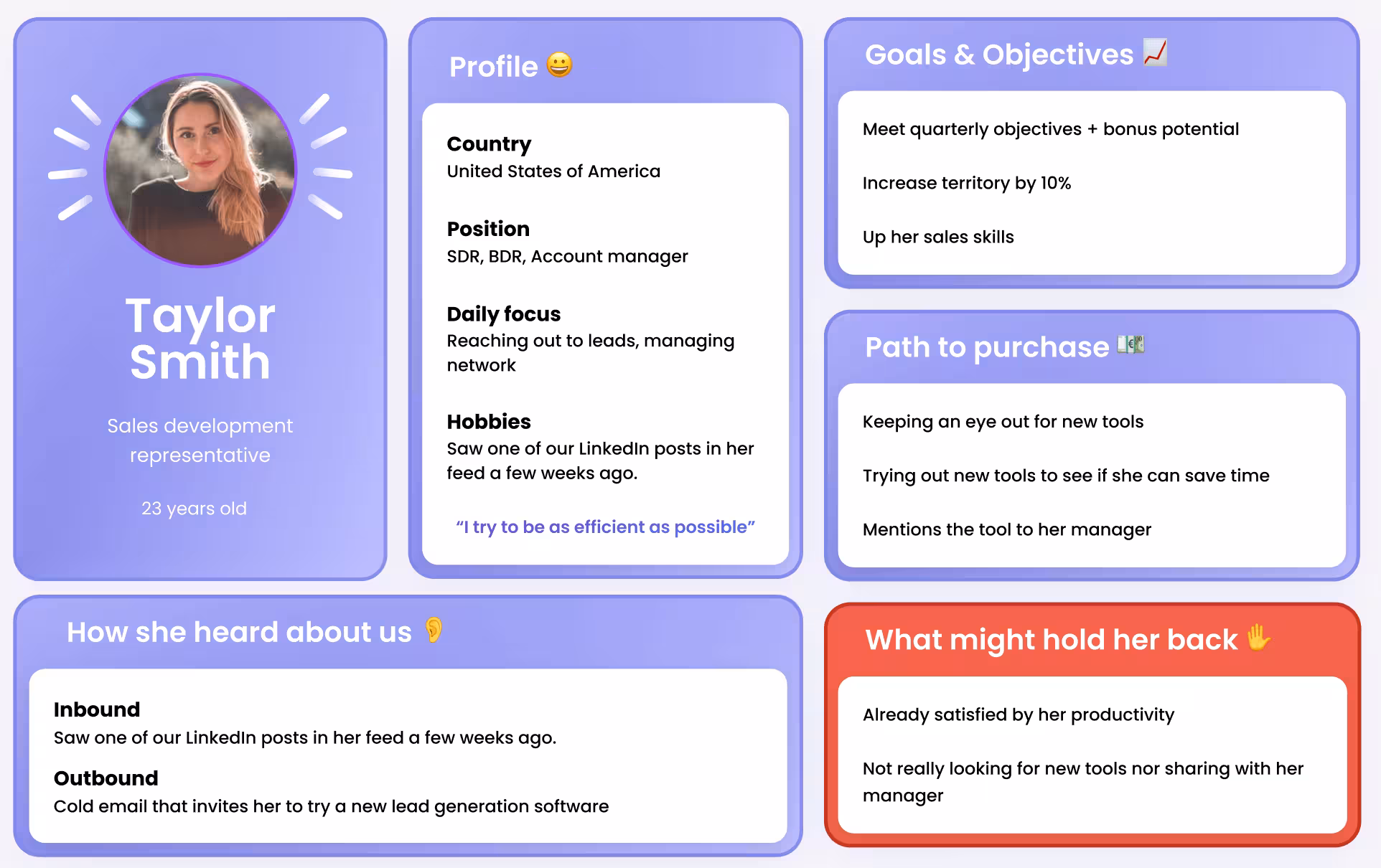 - Objections : What could go wrong? What would discourage this persona from being in business with you?