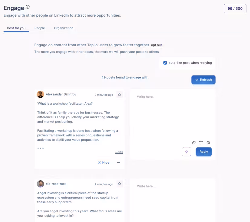 Pro tip: If you want a tailored list of the best people to engage, you can get it with Taplio and boost your visibility without spending extra resources