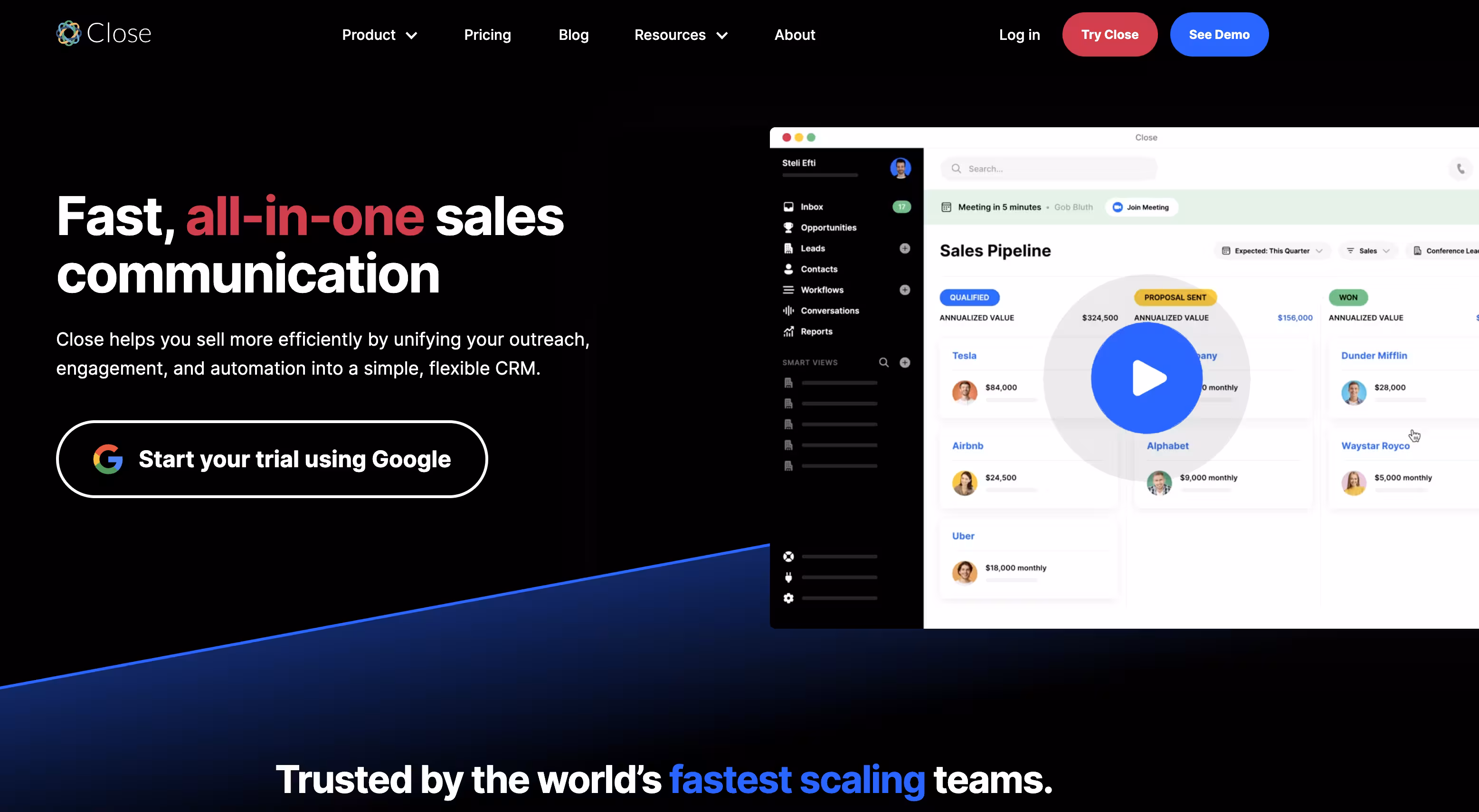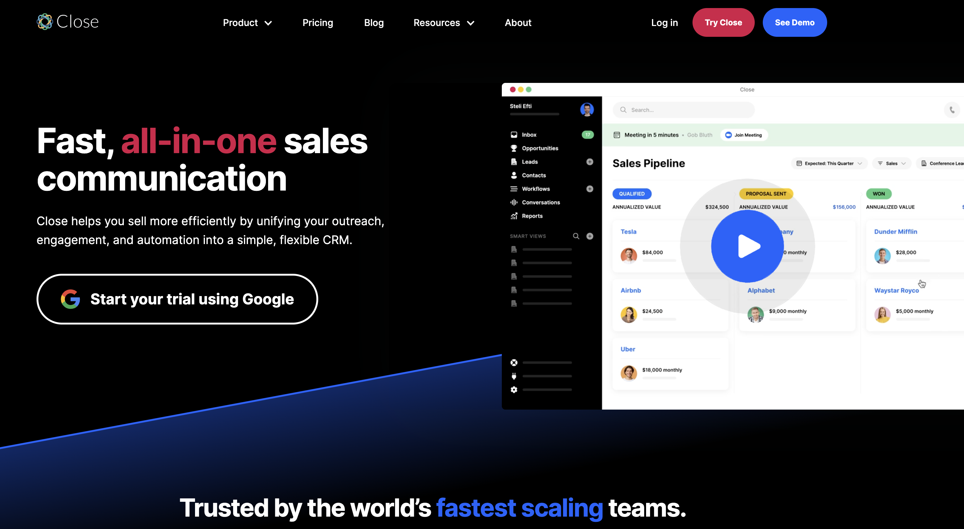 Close is a CRM platform designed to help sales teams close more deals. It offers integrated calling, two-way email syncing, and sales automation features to manage relationships with leads and customers effectively.