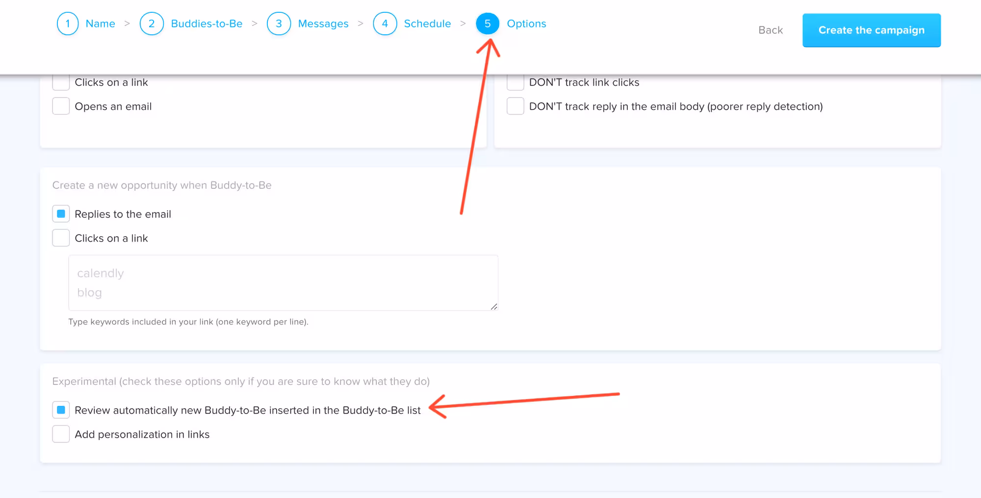 Step 6: When on “Options” stage in lemlist, put a mark on “Review automatically new Buddy-to-Be inserted in the Buddy-to-Be list”.