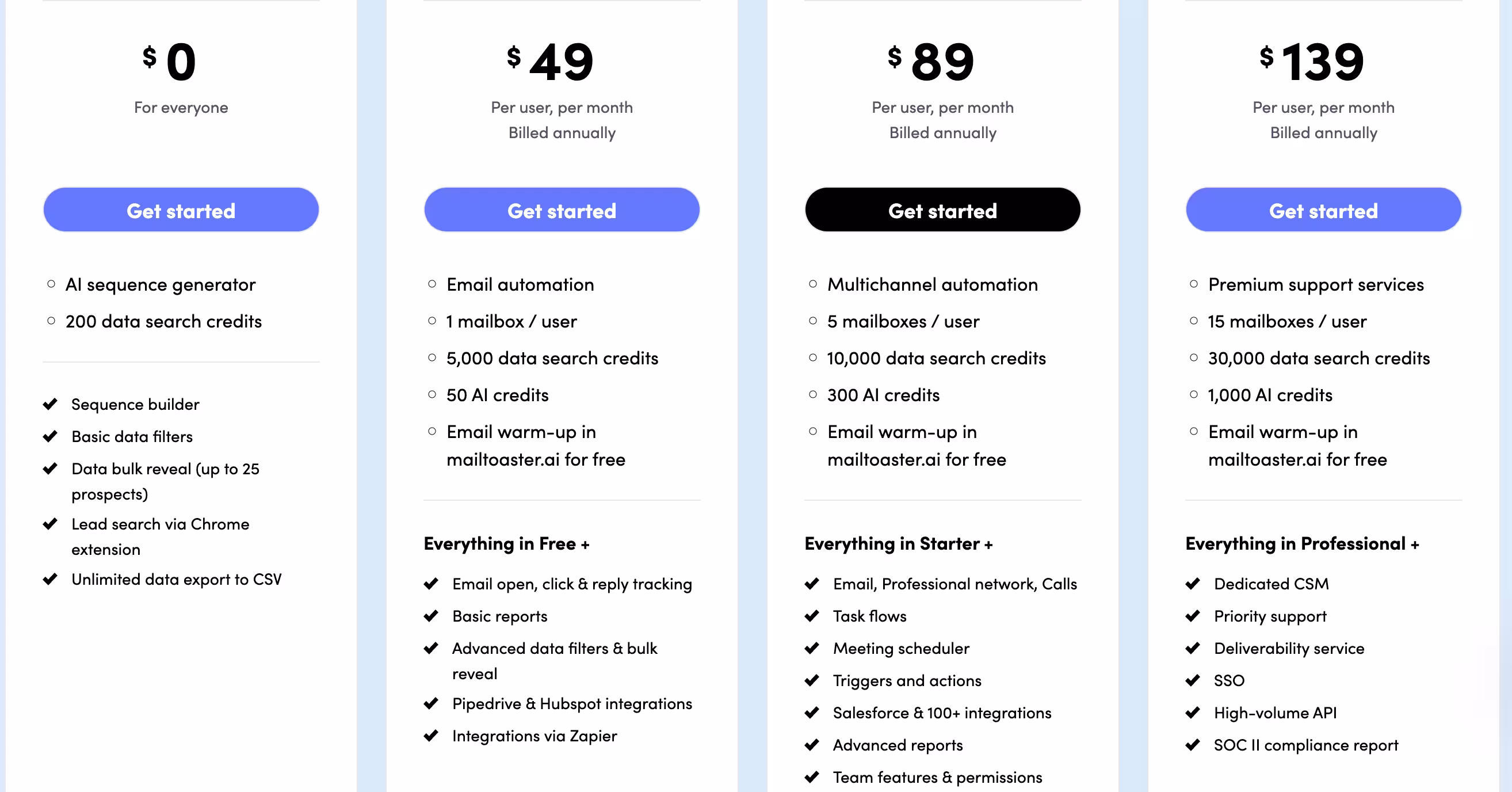 Users in need of add-ons like extra mailboxes, email warmup, and email verification must pay more. The pricing limits how many people sales reps can contact monthly and how many sequences they can configure.