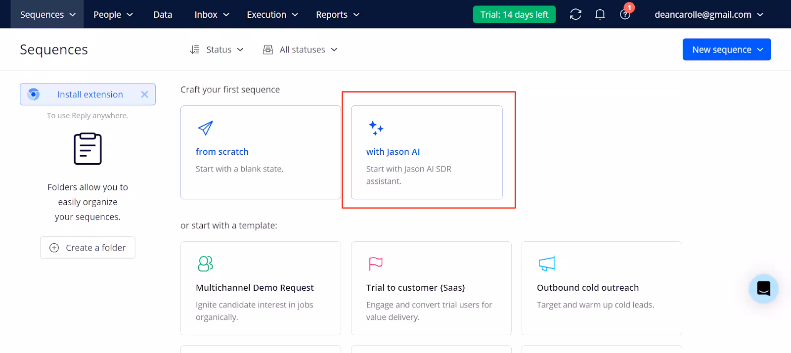 - When creating a sequence from scratch, users have complete control over the steps, including email, LinkedIn interactions, calls, and more. On top of this, you have a variety of pre-made templates for different use cases, which can be customized and enhanced with Jason AI.