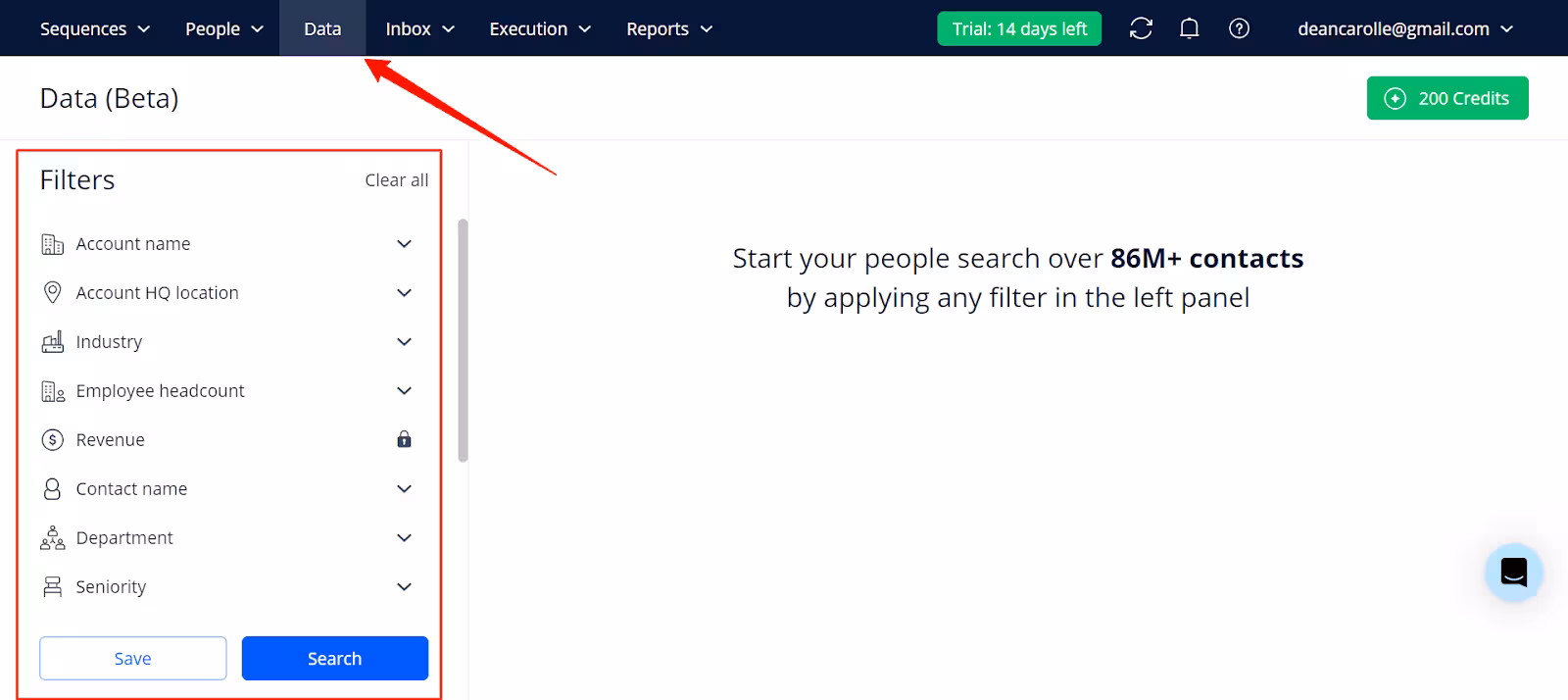 The data section allows you to access a database of over 86M+ contacts with filters that you can apply to match your ICP.