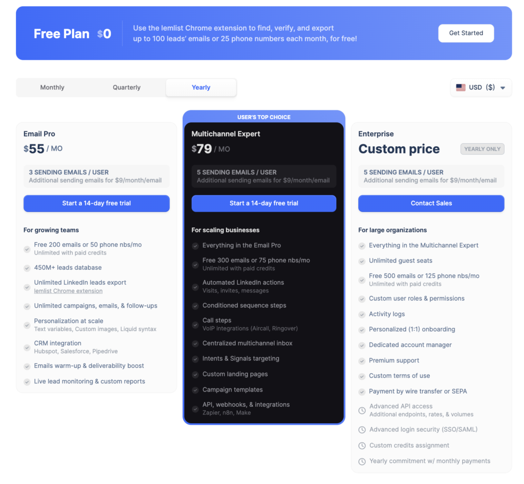 lemlist has four basic tiers, which also include access to lemcal and lemwarm, making it the most comprehensive tool out there.