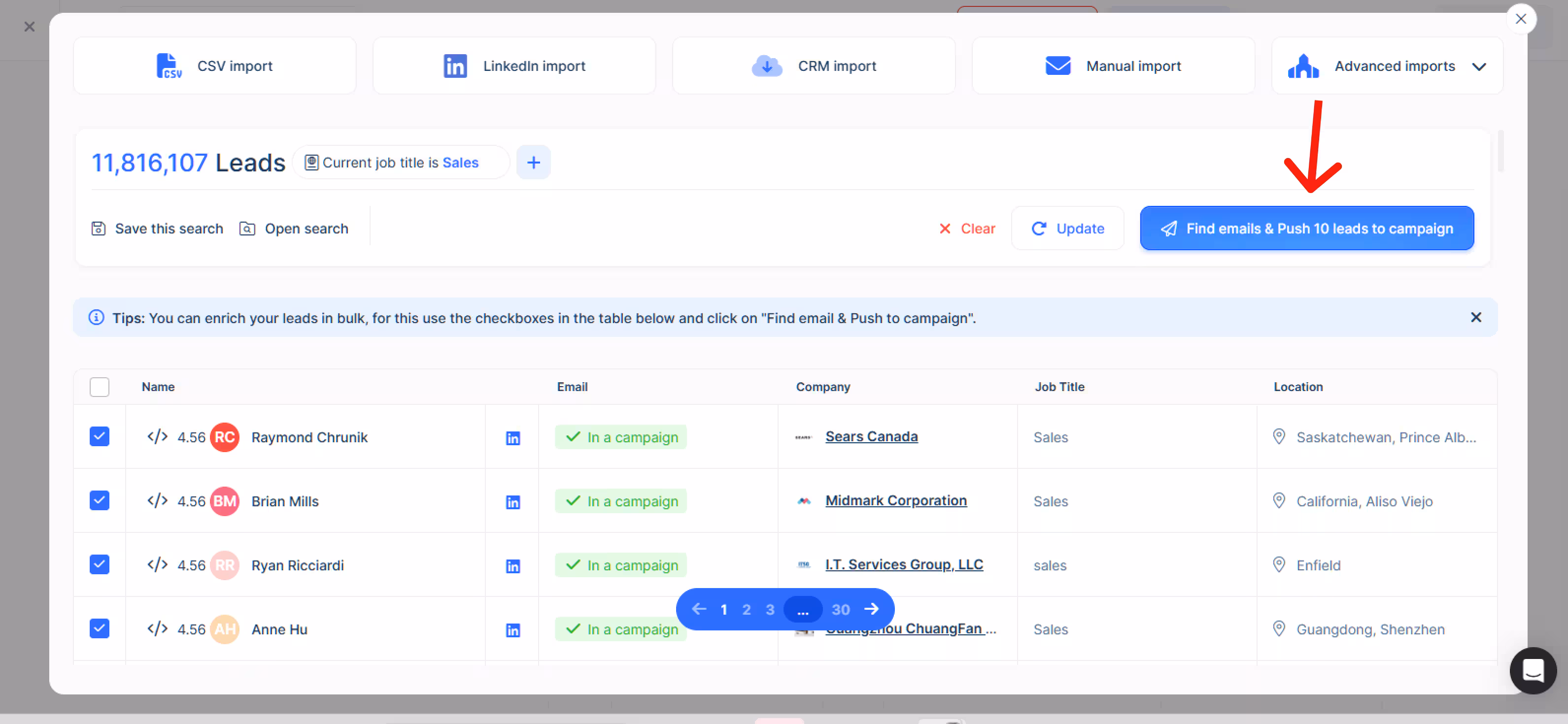 lemlist offers a 450M+ leads database that can be filtered by various criteria like: