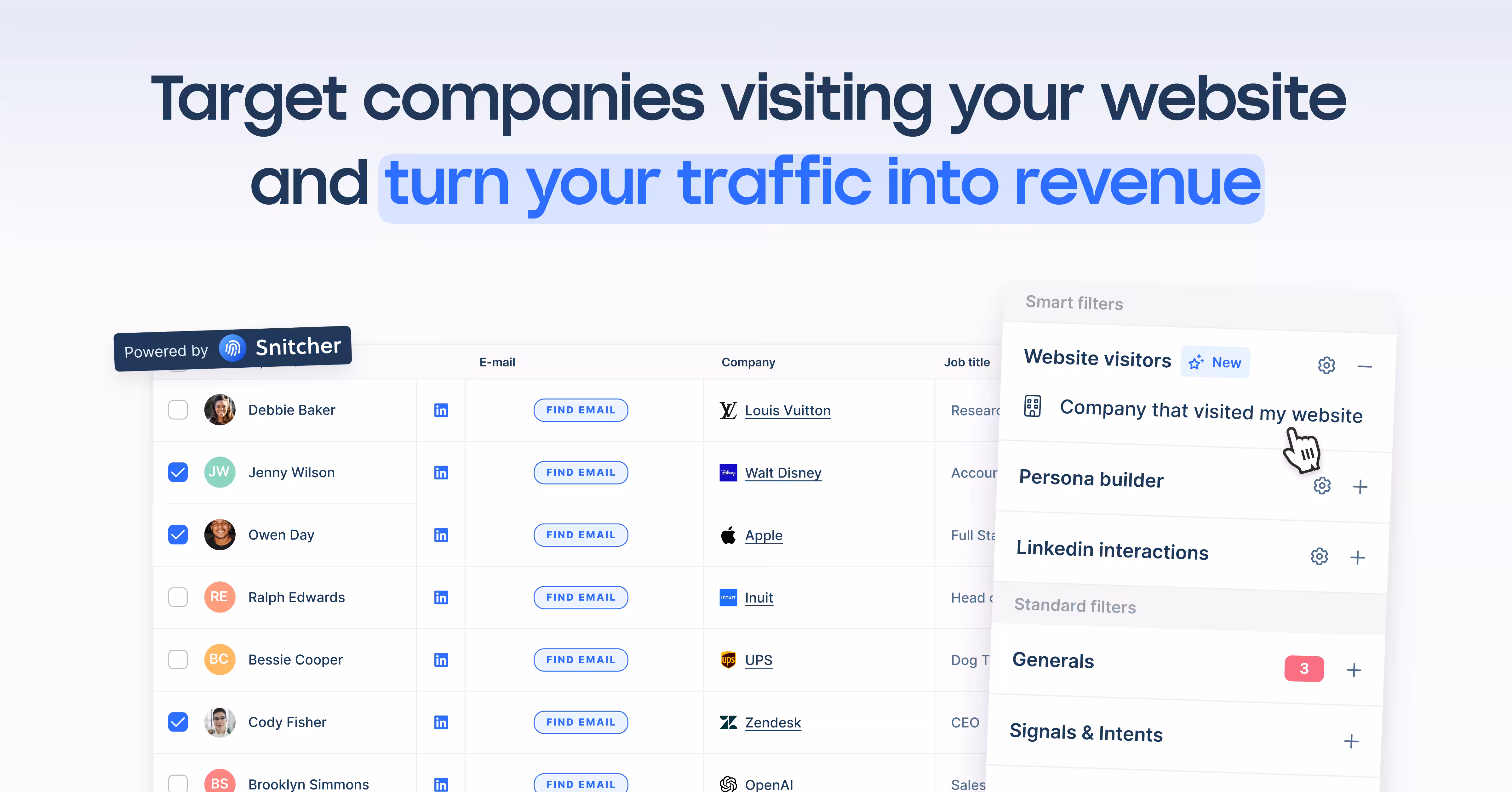 Install website tracking script to enable the market’s most reliable provider, Snitcher, to identify companies that visit your website.