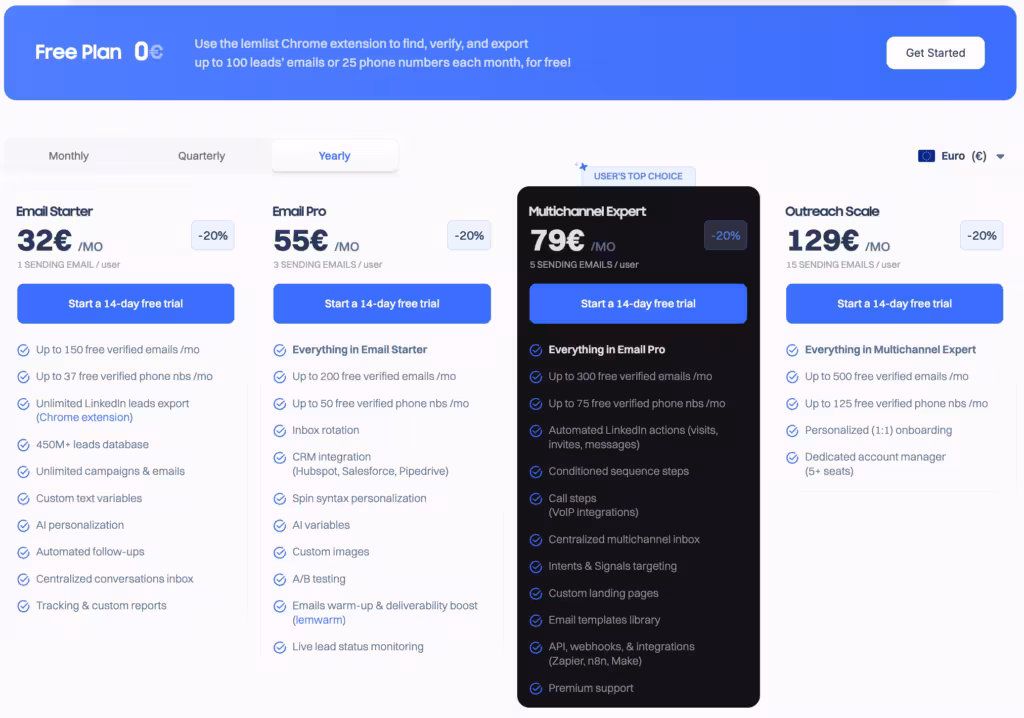 lemlist offers 5 different pricing plans for you to choose from, including a 14-day free trial for every plan and a completely free plan.