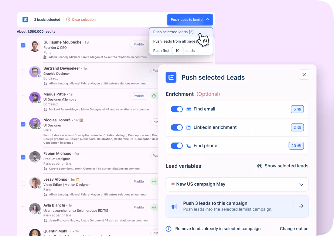 Find, enrich, and add LinkedIn contacts to your outreach campaign, without leaving LinkedIn.